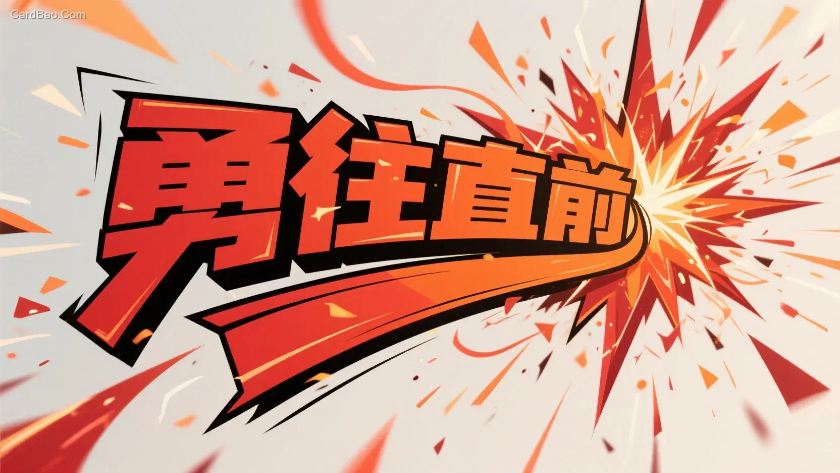 艺术字体“勇往直前”,动态爆炸风,弧形延展,笔画爆发状延伸,线条扭曲中带张力,漫画拟声字。