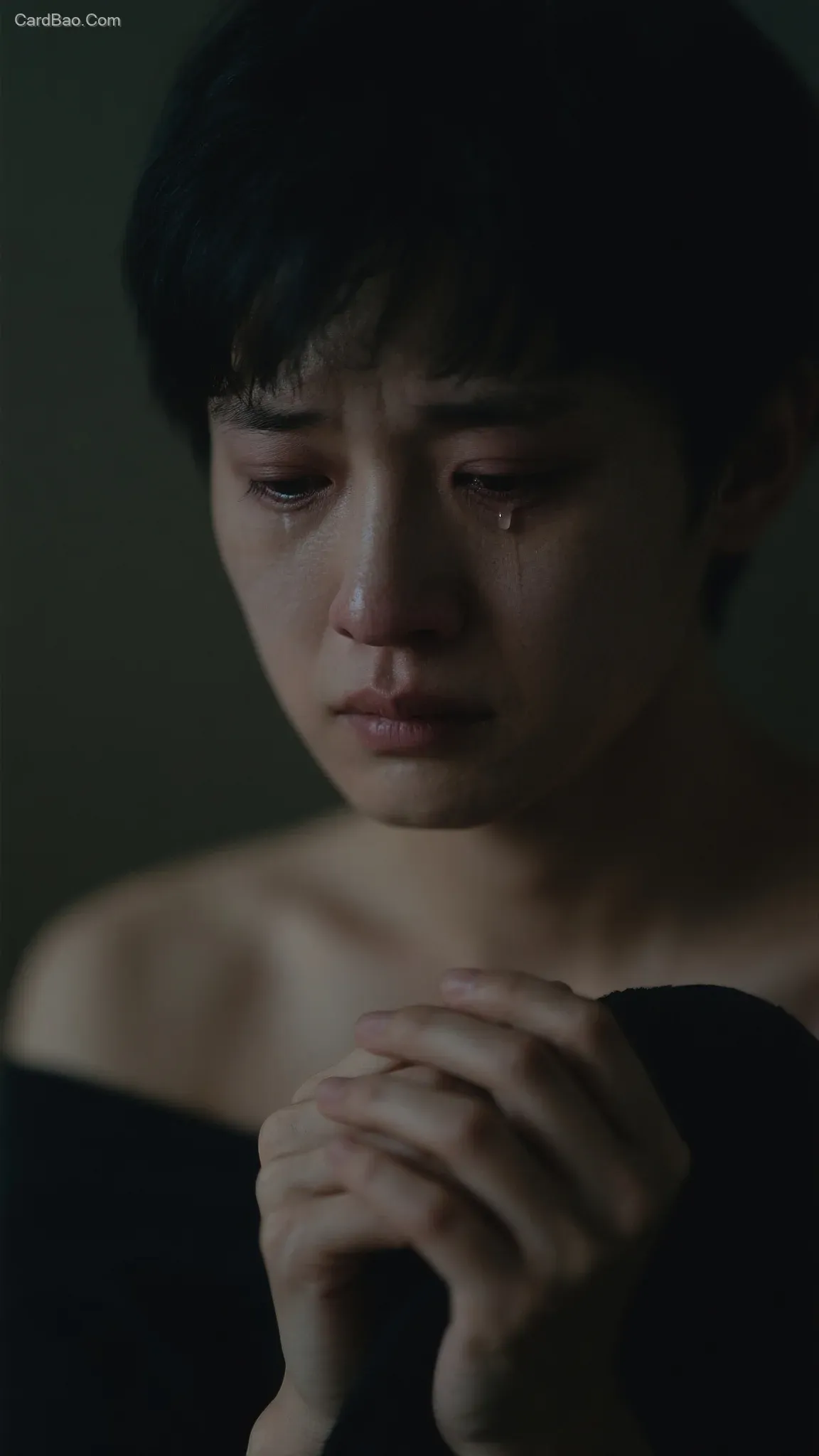 一个人的中景镜头,此人目光低垂,微微皱眉,一滴眼泪顺着脸颊滚落。肩膀微微耸起,双手在身前交握,流露出脆弱的神情。昏暗柔和的光线营造出一种忧郁、内省的氛围。