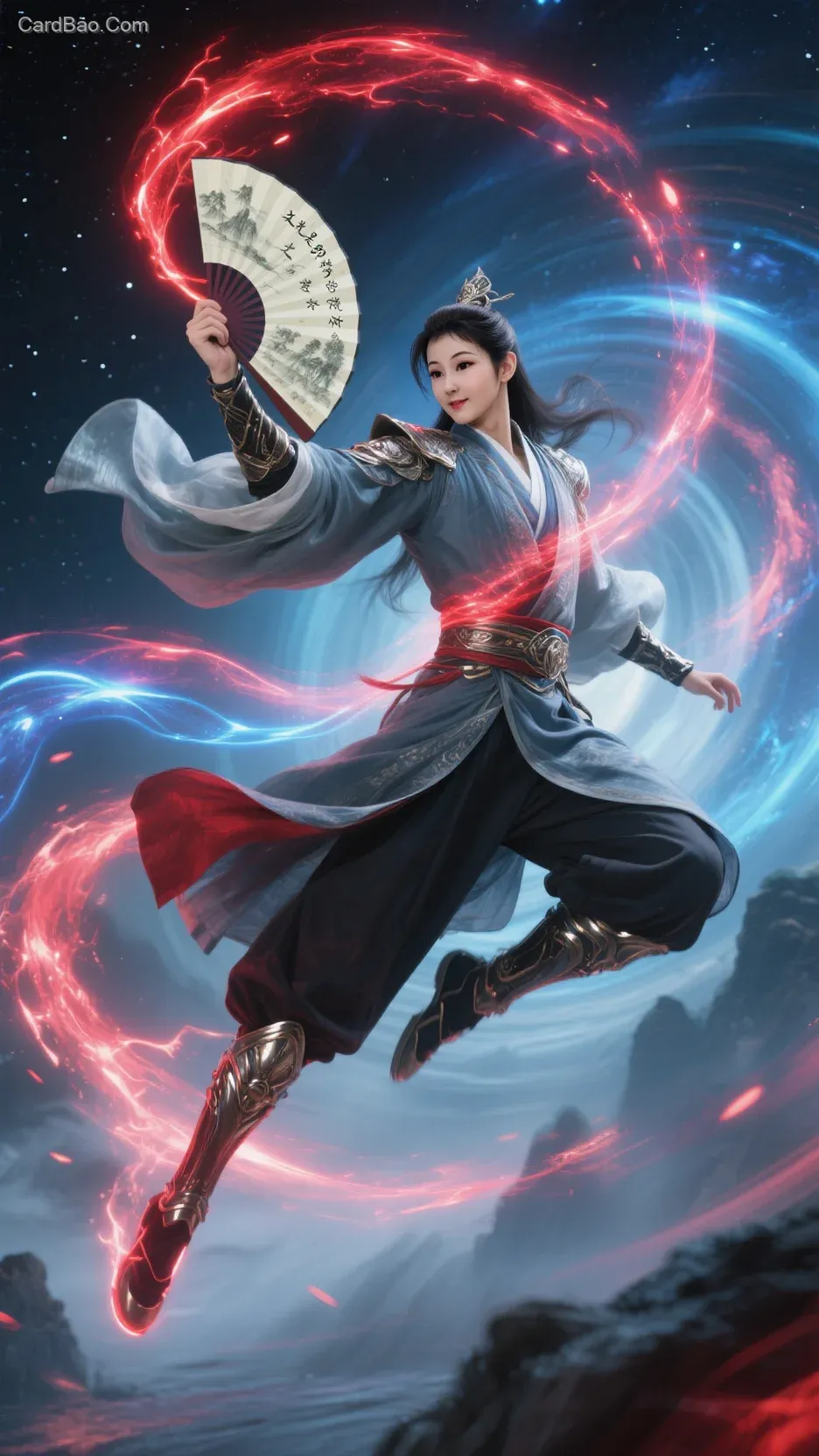 ## Ancient style, a handsome man in a fantasy scene leaps into the air, holding an exquisite jade landscape fan that emits light, inscribed with the words: "Wen Guang is a feverish dream enthusiast." Close-up shots showcase varied poses and movements, with his entire body enveloped in red energy particles and blue light beams. Dynamic blur traces his jumping trajectory, while a noble and luxurious极品 magic robe billows in the airflow. Close-ups highlight the robe's changing colors and styles. The background features a星空 vortex effect, with立体光影 accentuating the character's resolute facial expression. Futuristic metal armguards reflect the glow of particles.