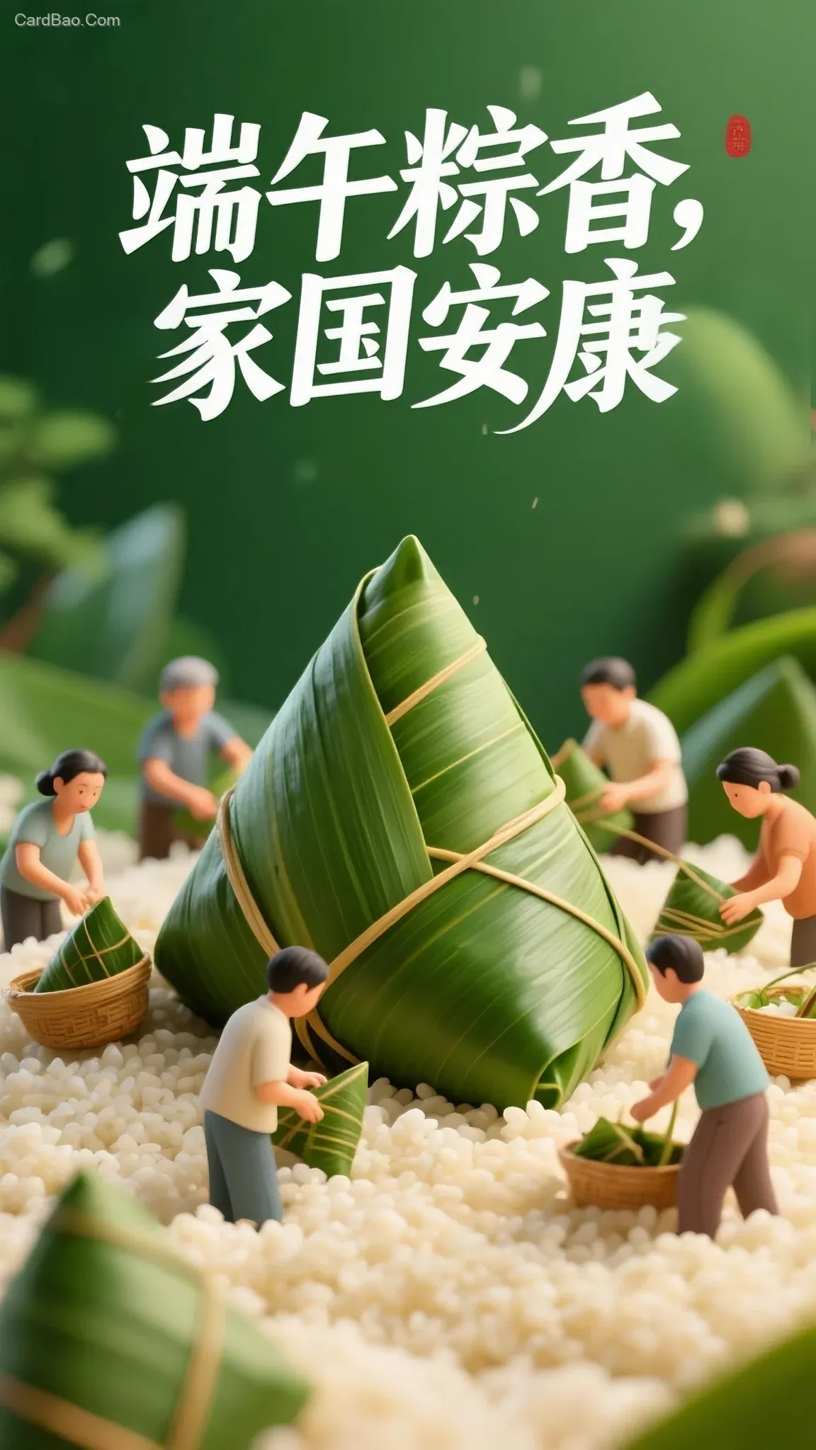 端午节海报设计,平面广告设计,3D 效果,微距风格,一个包裹着粽叶的粽子在糯米堆里,一群人正在糯米堆里面在制作粽子,粽子很大,和人形成反差,主题文字是“端午粽香,家国安康“,主图用现代艺术字,绿色和米黄色颜色主题,