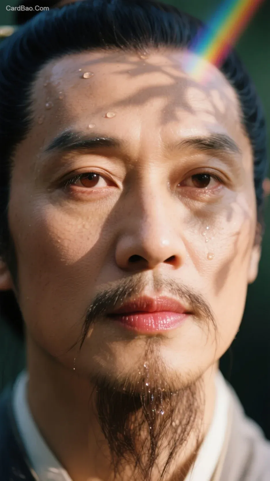 Portrait photography of Confucius, age 35, with refined and elegant features. Dappled tree shadows cast across his face, while moist eyes lock onto the center of the lens. A close-up of his lips reveals a blood-red gradient beneath translucent enamel. Water droplets suspended from hair tips refract rainbow spectrums, captured by a Hasselblad XCD macro lens that traces the residual pearlescent particle trails within the fine grooves of lip textures.