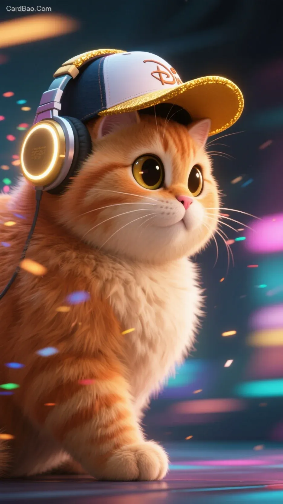 胖橘猫(绒毛质感蓬松柔软呈现渐变条纹,圆润眼反射环形柔光板高光,立体鼻头,侧逆光勾勒绒毛边缘金色辉光,Q弹脸颊轮廓,高速同步闪光凝固飘散在空中的粒子,迪士尼卡通材质渲染技术展现细腻布纹肌理),高分辨率,8K,精致且美丽,多彩,光线追踪,侧面,OC渲染,头戴棒球帽和耳机,赛博朋克风格,超现实主义,高级感,动态优美,氛围感,朦胧美,明亮,极简风,人物运动模糊摄影,高级强烈的运动模糊和动感模糊,模糊到只看得出人物轮廓。