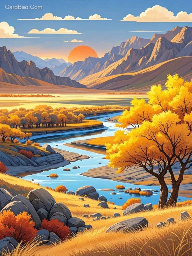 新国风结合彩岩风格展现塞北秋景。近景金黄草原,暖黄笔触表现草浪,胡杨棕褐树干,金黄树叶脉络细腻。河流蓝白相间,河床石有青苔。远处山脉硬朗,棕红深灰为主,点缀斑斓植被。蓝天深蓝平涂,白云轻柔,夕阳橙红与蓝天渐变过渡,尽显豪迈壮丽。