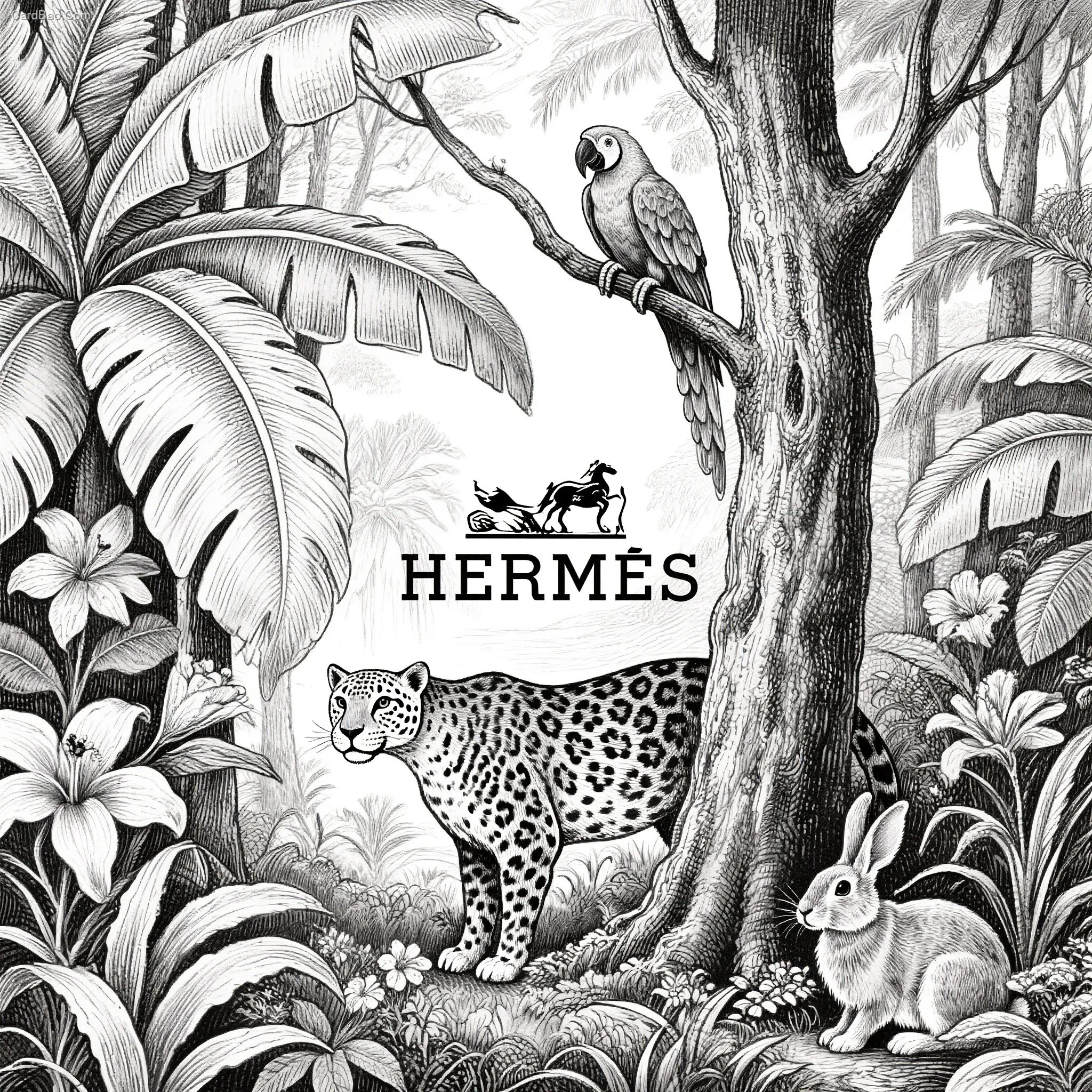 爱马仕丝巾设计,一个黑色的很小的爱马仕的logo在画面中间,黑白钢笔画风格,精细的细节描绘,精细的钢笔画笔触效果,画面是梦幻的原始森林场景,巨大的宽叶植物,盛开的奇花异草,一只藏在树叶后的猎豹,一只落在树梢的鹦鹉,一只藏在灌木丛里的兔子,混合图案