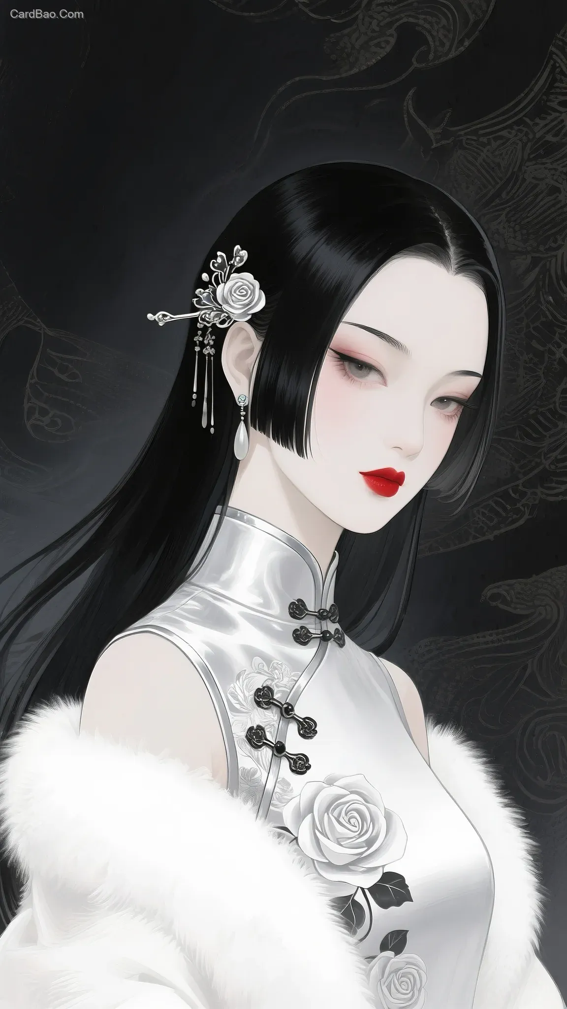 手绘插画,中式美学,国风插画,笔触感,肌理感,御姐,公主切,长直发,长发飘逸,中式穿搭,银白色系旗袍。旗袍上有玫瑰花,白色毛绒外披,面部特写,白面红唇,精致,黑帮大小姐风范,女主,风华绝代,精美发簪,邪魅,高冷,慵懒,黑发,黑色背景纹理图案