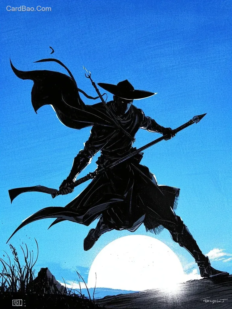 灵魂画手,手绘线稿,涂鸦风格,简约,克莱因蓝线勾勒,落日与古代侠客,侠客披风飘动,手拿长矛,形成大小对比,人物的剪影与背景明亮的落日形成明暗对比。,动态视觉,手稿,大师杰作,白色背景