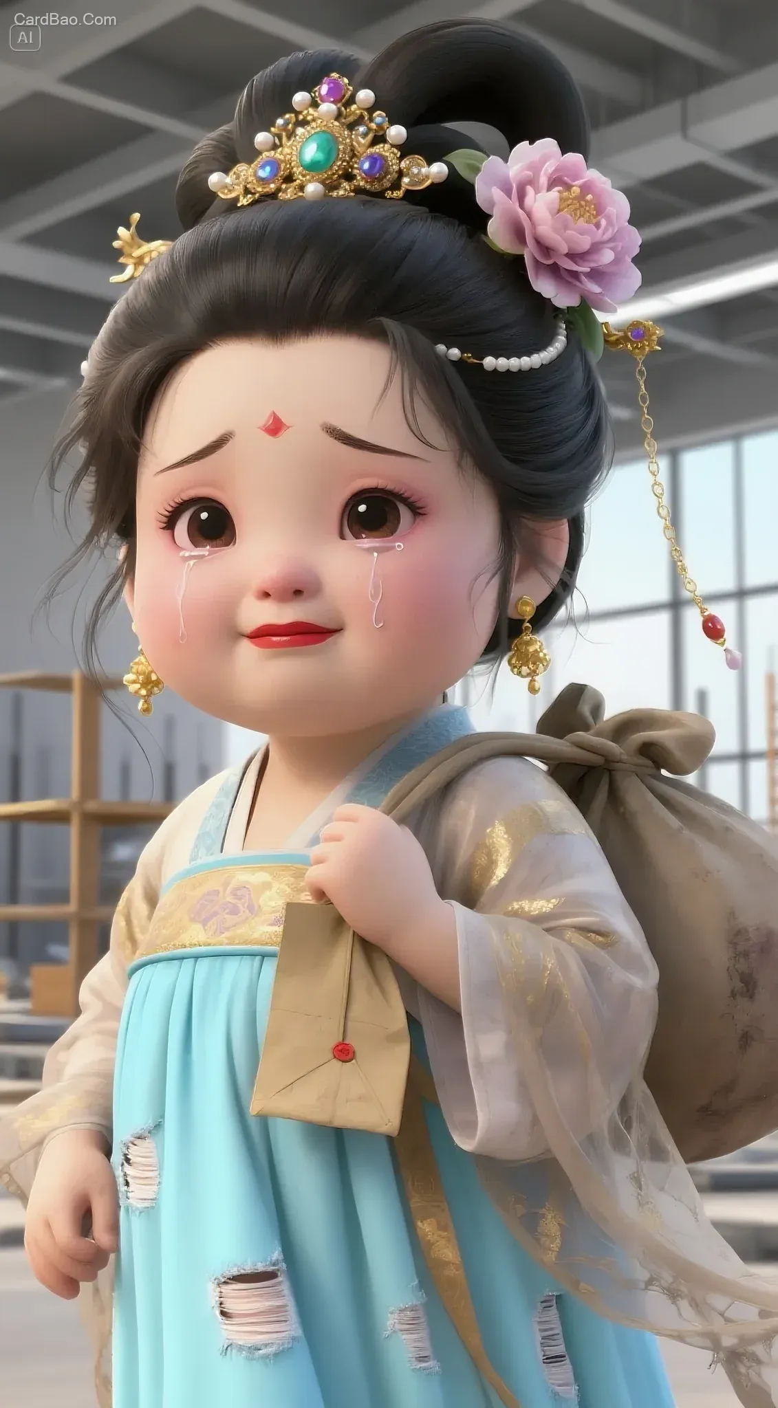 At a bustling construction site with a modern minimalist style, a person dressed in Hanfu is working. The upper part of their Hanfu is cleverly paired with a unique skirt featuring light blue distressed designs, showcasing a striking blend of fashion and contrasting aesthetics.