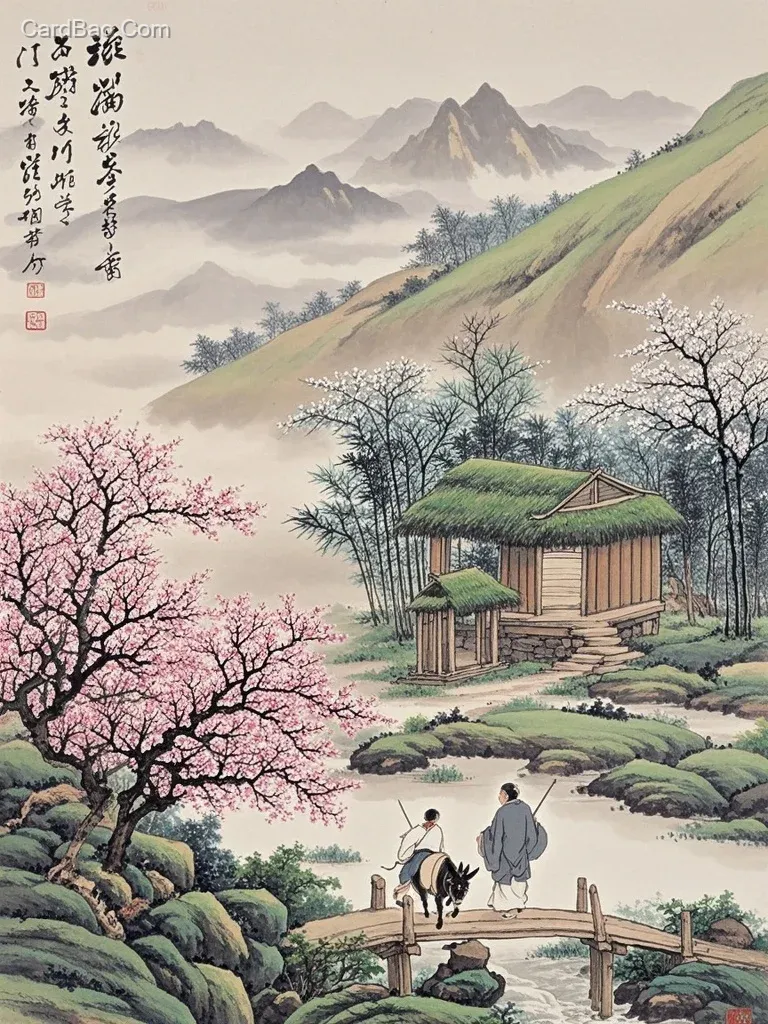 古风水墨山水美景,桃花和李花参差环绕着小木屋,屋后有竹林,小路蜿蜒绿草茵茵,文人拄着竹杖回家,书童牵着驴紧紧跟随,一起走在山溪的小桥上,远山层叠,云雾缭绕,山体劈麻皴,金碧山水设色,落款用草书写着“云深处”,盖两枚印章。