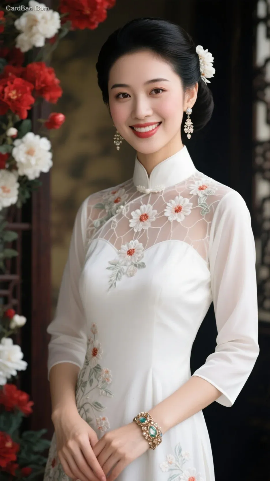 一位古代美女微笑,白色刺绣衣服,越南头发,耳环图钉,珍宝手镯,背景古代,半身照片,高清图片。依服换红色白花,挺腰,依服胸上面透明网沙花