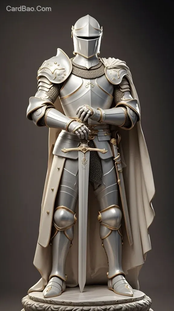 大师级白瓷薄胎雕塑,西方板甲高大大剑骑士,全套西方板甲(头盔、披风、手套,上臂甲、肩甲、护腰,腿甲、半人高重剑),按剑肃立姿态,动态层次丰富,极致质感,肌理感强烈,oc+cg+c4d渲染,hdr肌理,细节清晰详尽。大师级的、精致的、生动的、有质感的、立体的、富有张力的、震撼的、逼真的、细腻的、独特的。奥古斯特·罗丹。白瓷薄胎雕塑(西方骑士写实风格)。白瓷薄胎工艺赋予雕塑独特的光影效果,板甲边缘线条硬朗规整,体现坚固与规整;骑士身体线条展现力量与优雅结合。高光凸显板甲光泽,阴影增强立体感和层次感。对头盔纹路、手套指节、上臂甲关节、肩甲装饰、护腰造型、腿甲防护结构、重剑剑身纹理等细节精细刻画,面部表情严肃坚定。用白瓷薄胎表现板甲光滑坚硬质感和骑士面部细腻肌肤质感,通过光影色彩强调材质特点。将西方骑士题材与白瓷薄胎工艺融合,展现独特艺术美感。全景展示骑士整体姿态体现威严气势,特写板甲细节和面部表情突出精致细腻。正面视角让观众直面骑士威严,可适当调整视角高低展现不同效果。利用光影变化和表面起伏表现线条层次,增强立体感和深度。