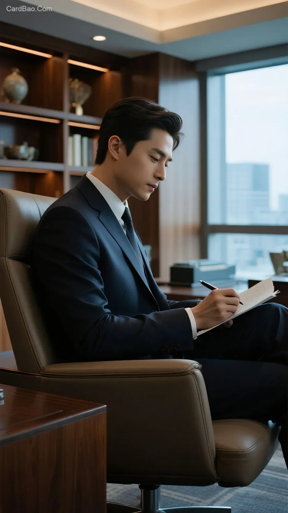 一个年轻的霸道总裁,坐在办公椅上,正在批改文件,豪华办公室,全景,专业高清摄影