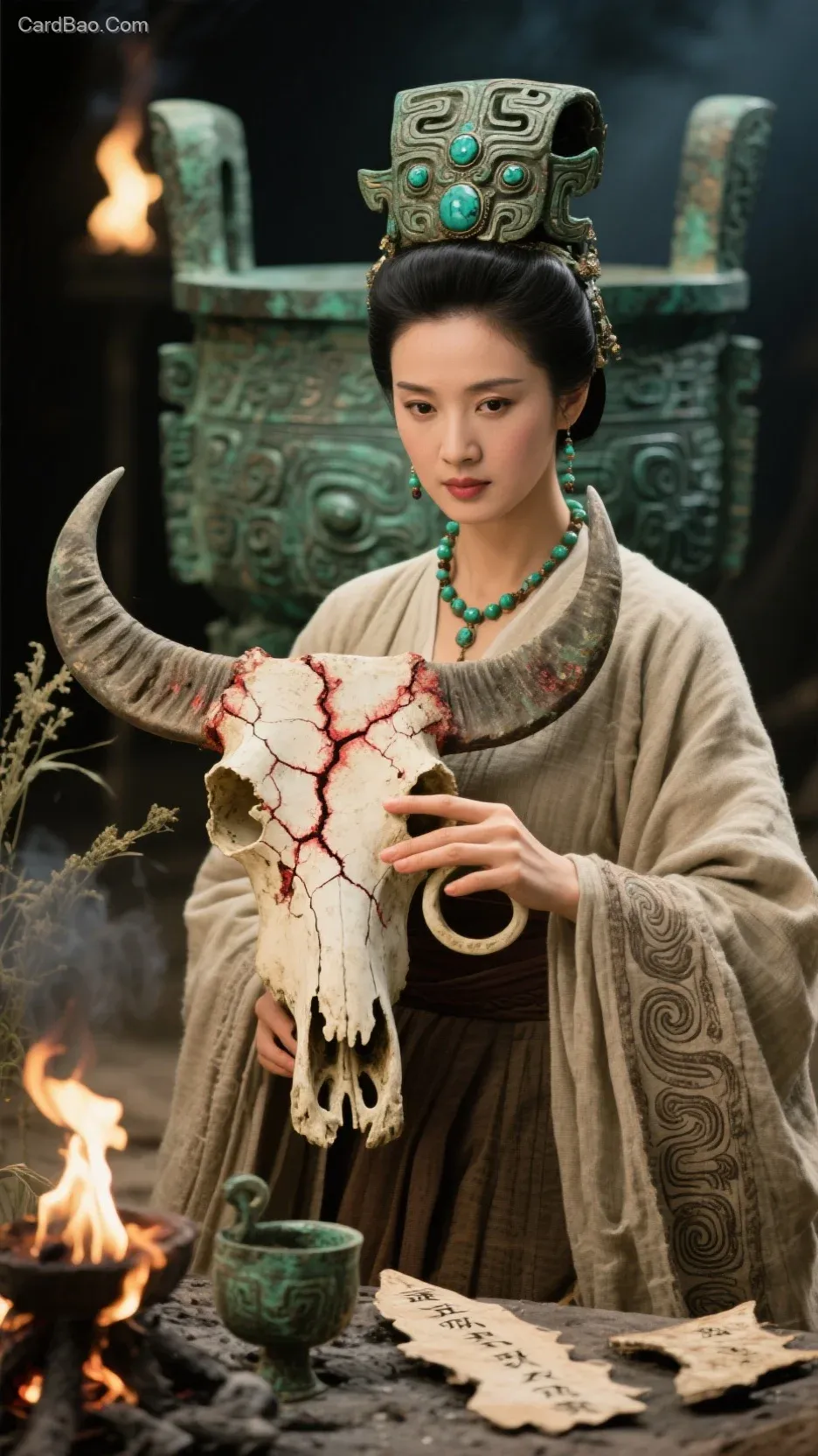 商代女祭司半身特写,林青霞立体骨相眉间深锁,杏仁眼凝神注视手中带裂纹的灼烧过的牛肩胛卜骨,青铜饕餮纹冠镶嵌绿松石与孔雀石珠串,殷墟织物结构的苎麻右衽长袍垂坠褶皱,衣襟夔龙纹随前倾姿势卷曲,祭司右手食指轻抚骨面灼裂纹路,左手托举卜骨显露环形灼烧孔洞,后方虚化的司母戊鼎兽面纹若隐若现,顶光与龟甲火堆将青铜冠照出铜绿氧化斑,鼻梁高光反射青铜觚的冷光,卜骨裂纹渗着暗红朱砂痕迹,背景飘散蓍草灰烬与甲骨文残片,8K画质呈现指尖与骨片碳化肌理,祭司袍下摆凝结祭祀酒液的铜绿结晶,浅景深虚化处青铜鼎铭文化作光斑,面颊汗毛沾满占卜烟尘,褪色胶片颗粒沉淀在衣纹与鼎身铜锈间,画面充盈武丁时期重大占卜的史诗感