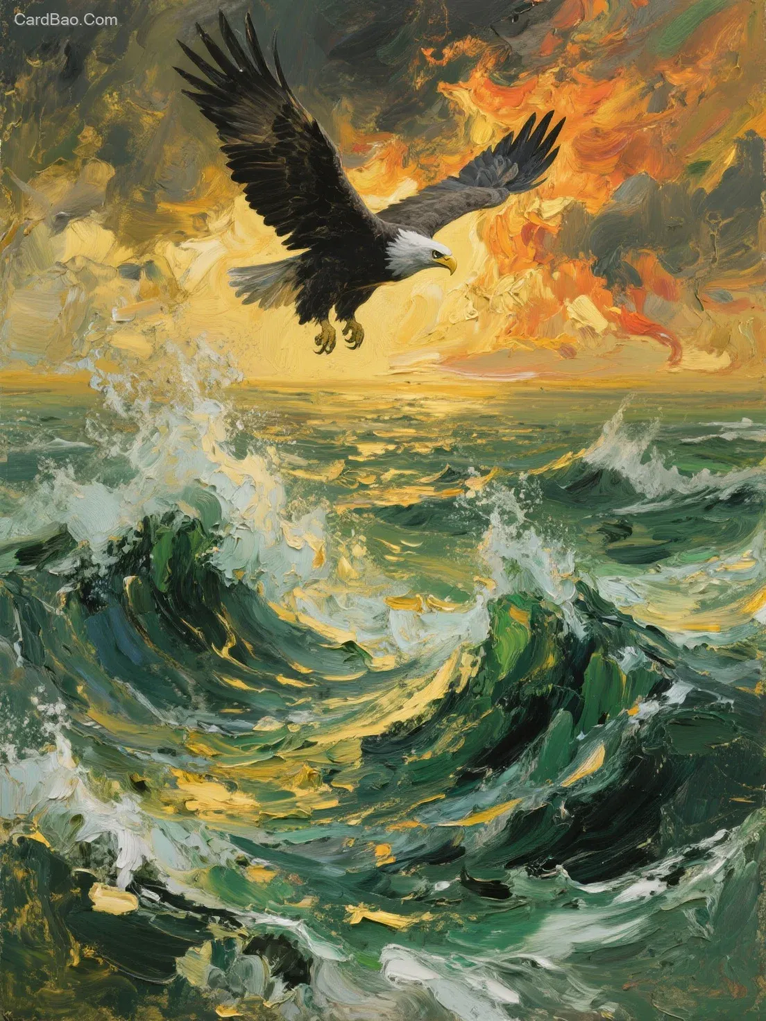 Oil paint, gold-green color scheme, abstract art, atmospheric intensity, emotional release, strong winds, blazing sunset clouds, stormy weather, raging ocean with towering waves, horizon line, close-up, eagle soaring high in the sky with wings spread, dark tones, deep depth of field, panoramic view, telephoto lens, full-body shot, chiaroscuro lighting, surrealism, intricate details, artistic, dreamlike effect, emotional resonance, vintage style, vibrant colors.