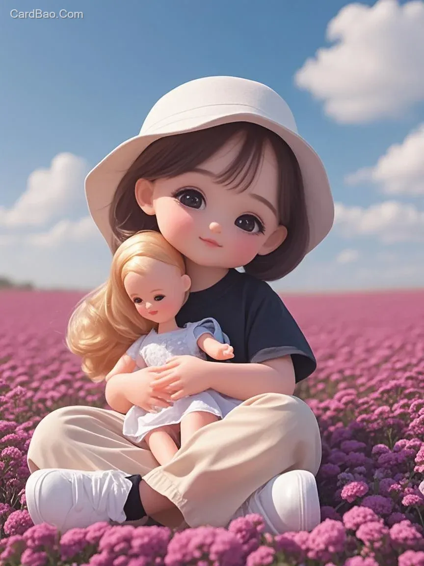 ## Background: A bright and sunny day with blue skies and fluffy white clouds. A girl wearing a white hat is sitting in a sea of hibiscus flowers, holding a Barbie doll. She displays various actions and expressions.
