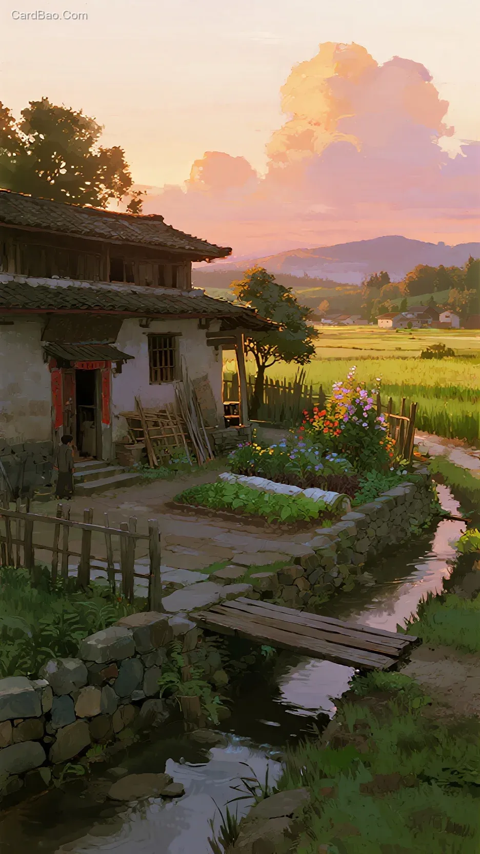 春天,傍晚晚霞,中国农村,平房村落,毛石挡墙,宽敞的小院,木头篱笆,有鲜艳花草,古树,翠绿的稻田,菜地,清澈的流水小桥,门口的木头,真实自然,笔触清晰,高饱和度,光影对比,细节丰富,高分辨率,半鸟瞰视角,3d效果摄影写真