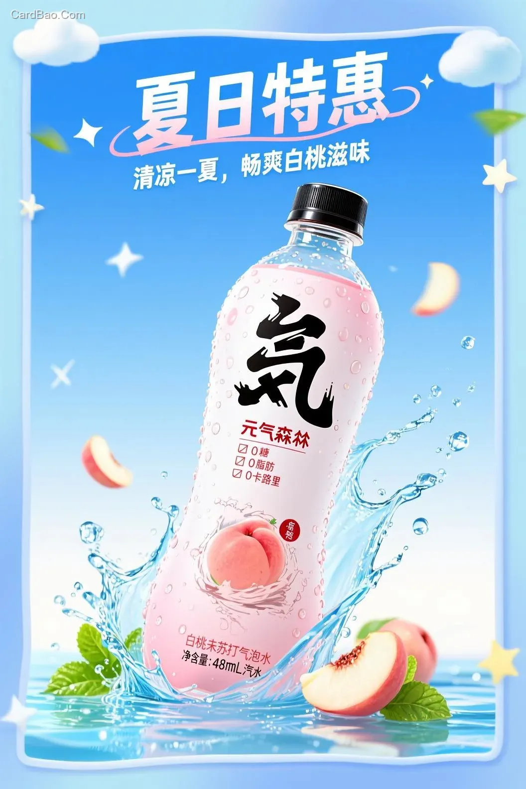 ##参考产品原图,C4D 写实风格,主视觉为一瓶倾斜的元气森林白桃气泡水,水下部分颜色偏粉蓝,有气泡浮升效果;水面部分泼溅出高动态水花、冰块、薄荷叶、飘散几片白桃果片;瓶体上附有水滴颗粒;远景为渐变蓝天范夏日阳光氛围,整体色调清爽高亮。顶部标题“夏日特惠”,少女梦幻风,曲线连笔,灵动的曲线,圆润软萌,具有艺术气息;小标题“清凉一夏,畅爽白桃滋味”,无边框设计