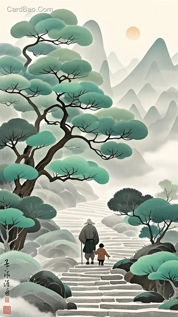 新中式水墨意境风格的山水插画。以淡绿色、灰白色为主色调,营造空灵悠远氛围。画面中展现蜿蜒的石阶小路,两侧是形态圆润、色彩柔和的绿树,搭配朦胧雾气。加入两位身着传统服饰的人物(一老一小 ),老者拄杖、幼者随行,行走在石阶上,体现人与自然的和谐。运用简洁线条勾勒景物轮廓,通过水墨晕染表现树木的层次与雾气的朦胧,传承东方美学,打造宁静恬淡的新中式山水意境,突出新中式水墨插画的独特韵味 。