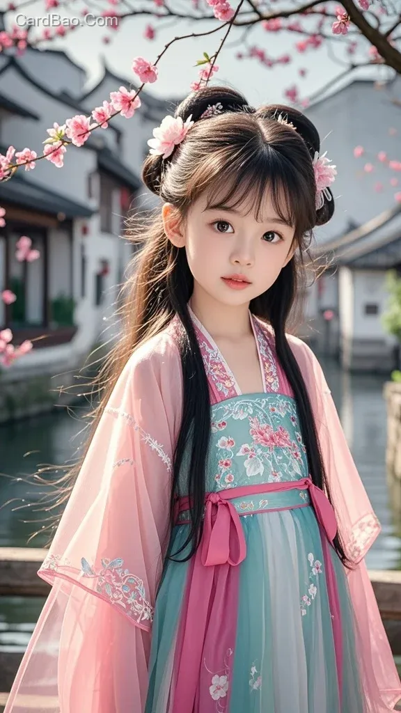 3D 渲染,超高清,超细节,超高清画质,近距离特写镜头,居中构图,一位 7 岁小女孩。小女孩五官精致得宛如精雕细琢,面容超级漂亮。她身着色彩明亮且精致无比的薄纱古装,粉色薄纱轻如烟雾,飘逸灵动,细腻的纹理清晰可见。其皮肤细腻白皙似羊脂玉,泛着自然柔和的光泽。长发及腰,双眼明亮清澈,犹如一泓清泉,透着纯真与灵动。衣带随风轻轻飘扬,为她增添几分活泼之态。背景是江南水乡,桃花妖妖,水墨画,构图优美,画面唯美有质感。