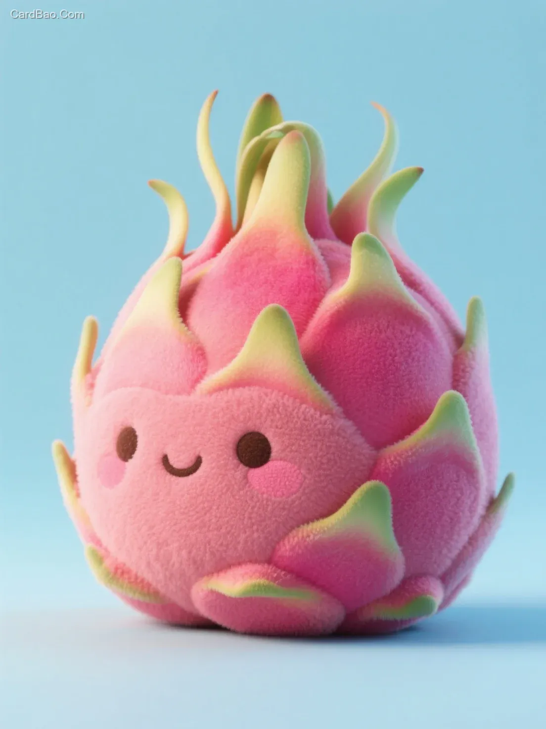 创建水果火龙果高分辨率3d风格图片,并将它们设计成可爱的微绒抱枕,其形状看起来柔软圆润和蓬松,使用微绒质感,并以配以柔和的阴影和灯光,以突出其立体感和真实感,将其放置在干净简约的纯色或浅蓝色背景上,并保持俏皮的立体美
