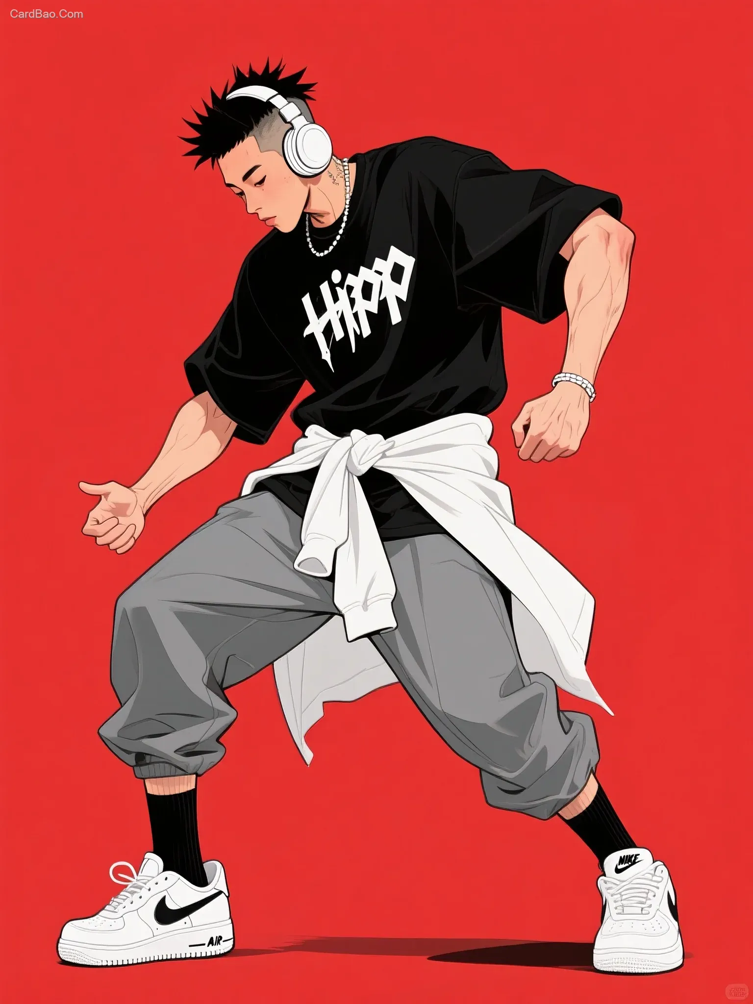 Red background, very cool, cutting-edge trend, trendy fashion style, medium shot. A handsome young man dressed in hip-hop street dance style, with an American forward-spiked hairstyle, wearing white headphones. He has on a black oversized short-sleeved shirt with white lettering, paired with gray loose pants and a white sweatshirt tied around the waist. On his feet are white Nike AF1 sneakers and mid-calf black socks. He strikes a classic hip-hop dance pose, exuding power, with well-defined muscle lines. The overall style is trendy and fashionable, presented in a hand-drawn illustration with strong line work.