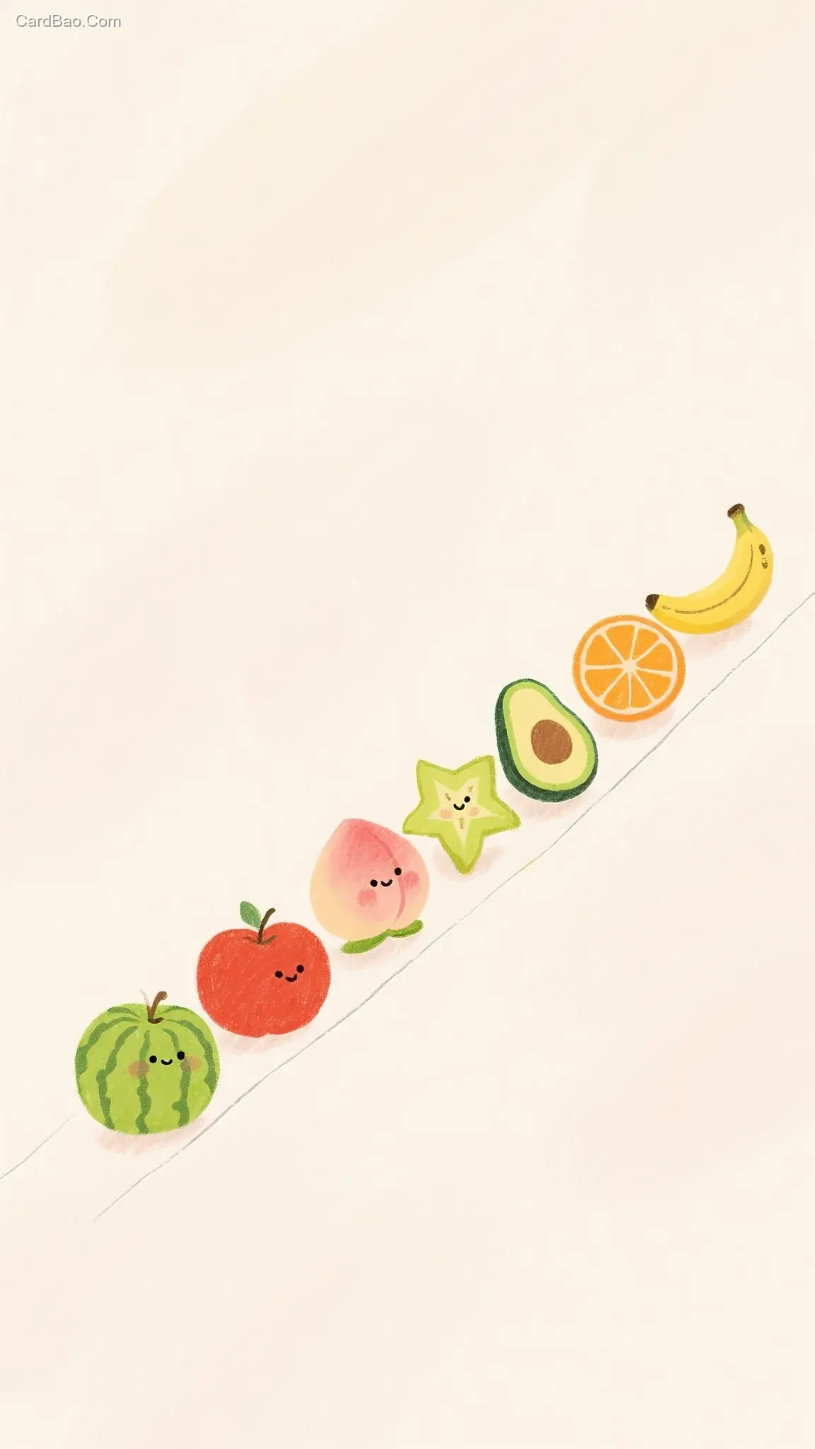 Hand-drawn illustration, simple line drawing, a row of fruits arranged one by one from left to right in a straight line: apple, watermelon, avocado, banana, orange, starfruit, peach, etc. Mini, cute, healing, full of childlike fun and imagination, ultra-detailed, minimalist background with soft light color washes, high-definition 32K, dopamine color palette.