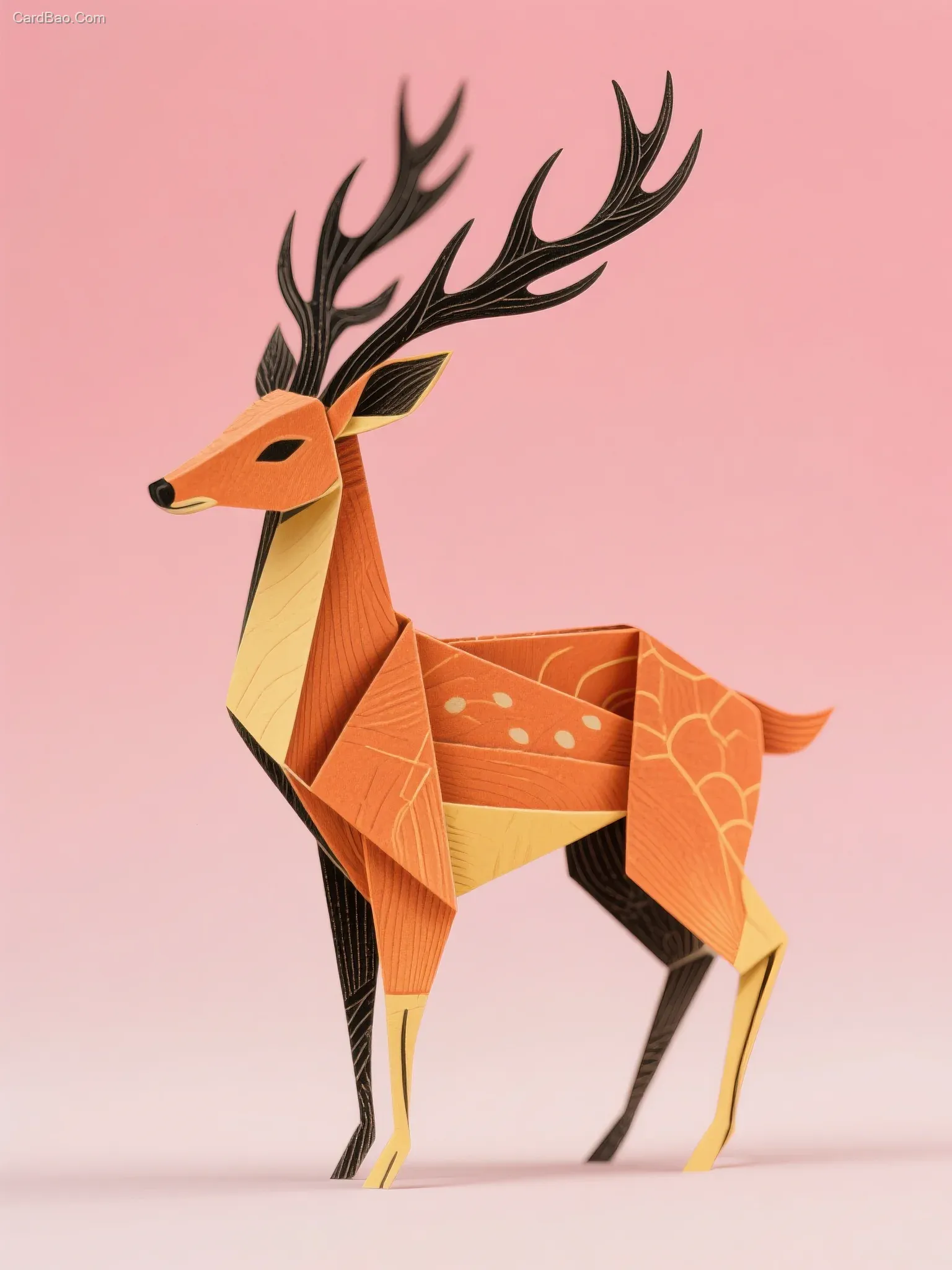中国折纸大师杰作,国潮古风,,极简主义,刘通的风格,前卫艺术,橙色黄色黑色原珠笔画,卡纸折叠成一只黇鹿,复杂的折纸压痕,以高定风式2.5D插画显示,马卡龙藕粉色渐变背景,传统折纸技艺,现代前卫艺术,高品质细节,超高清高分辨率,最佳品质,8K壁纸,