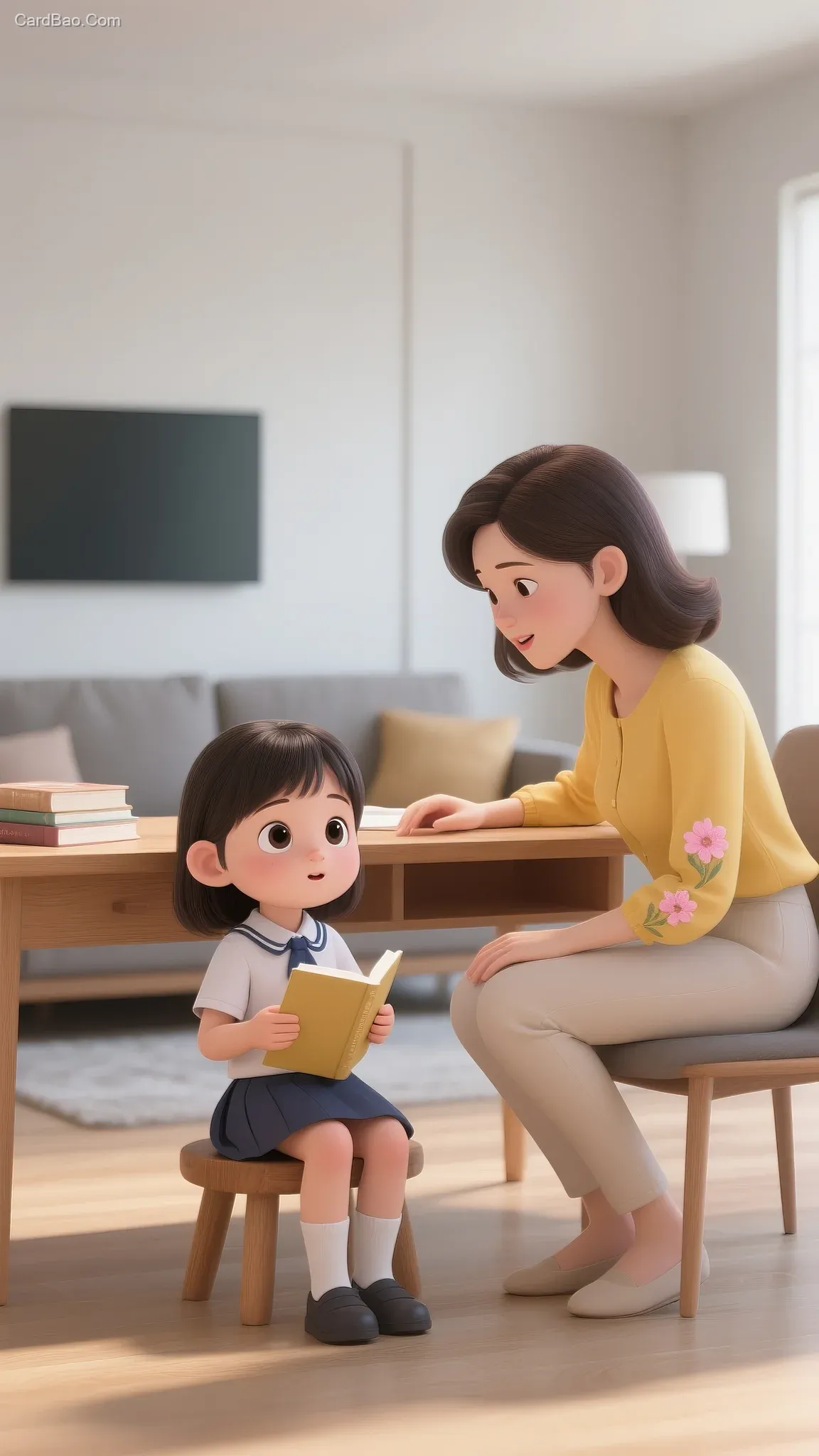 在现代简约风格的客厅,书桌旁,9岁Q版3D动漫女孩,坐在小凳子上,圆脸杏眼,身穿学生服。手中紧握着课本,乌亮的双眸满是纯真,正目不转睛地看向母亲,微微张嘴,一旁的母亲坐在书桌旁的椅子上,身着黄色现代元素上衣,下半身浅色裤子,袖口绣着淡粉色小花。同样微微张嘴,眼神中满是宠溺与耐心,整个画面温馨祥和,尽显母子间的深厚情谊。(3D立体,色调柔和,3D渲染,柔焦,最佳画质,8K,超级详细,简洁,可爱。)