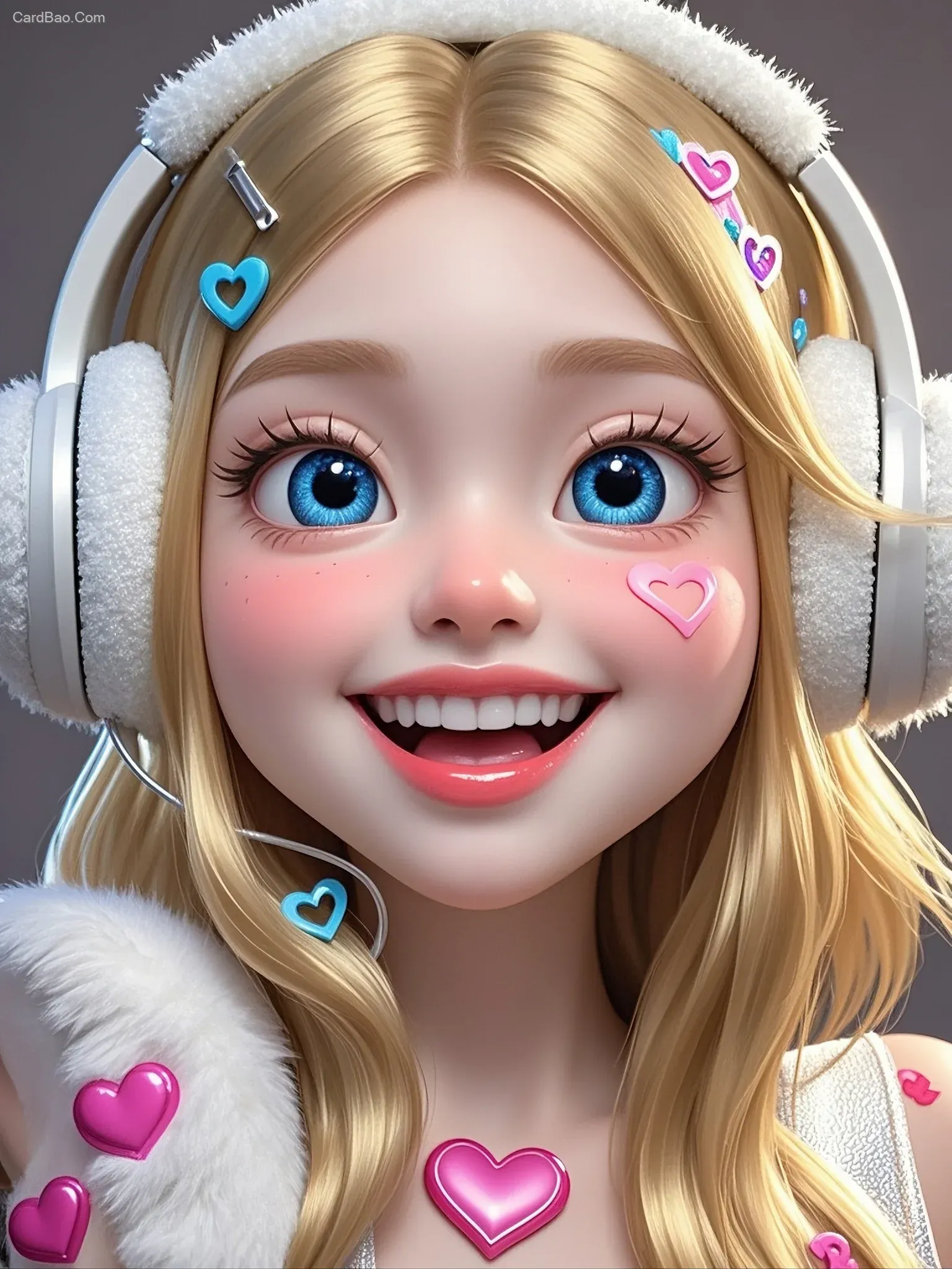 A girl wearing white headphones, with straight golden hair adorned with irregular heart-shaped patterns, big blue eyes, an open mouth, and a happy expression, in a 3D plush style.