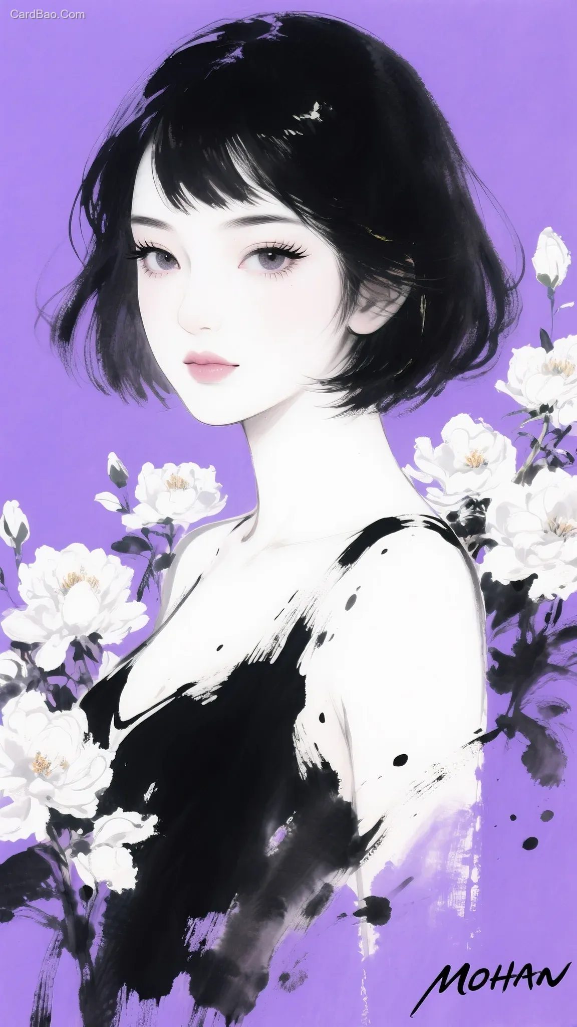 手绘极简毛笔水墨大写意,半身,墨汁组成短发绝色美女面容,大眼,长睫毛,墨汁弥散,动态模糊,不画身体部分,很多白色鲜花围绕,艺术作品,大胆抽象,高清画质,紫色背景,右下角签名:MOHAN