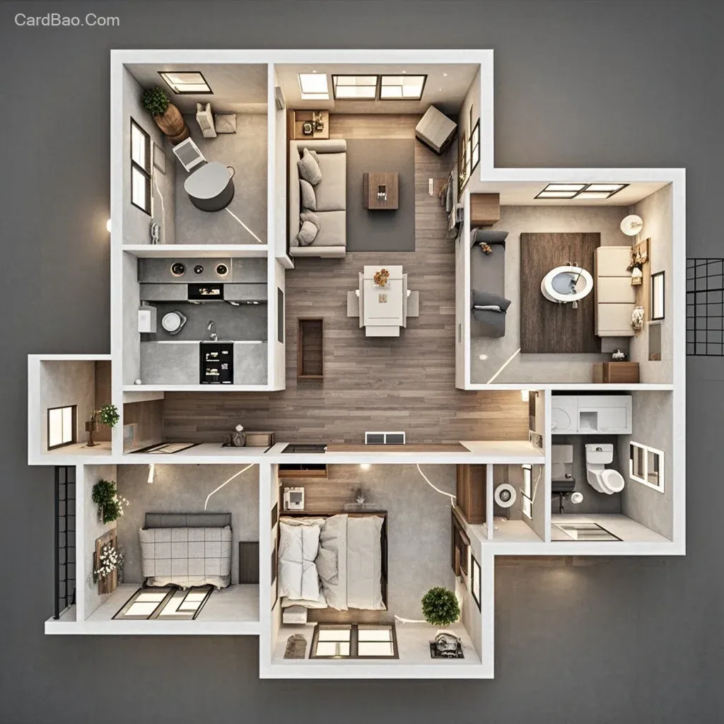 Interior design floor plan rendering, 110 square meters, three bedrooms, one living room, and one bathroom. The bathroom features a dry-wet separation with a shower, toilet, and sink. The living room has floor-to-ceiling windows on the balcony, with a washing machine and laundry cabinet. The kitchen includes built-in refrigerator, oven, and dishwasher. The living room has a 100-inch TV. The bedrooms are furnished with wardrobes, beds, and computer desks. Present a 3D perspective rendering in a bird's-eye view mode, panoramic, single-level (no split levels), in an Italian minimalist style with lighting design, square layout.