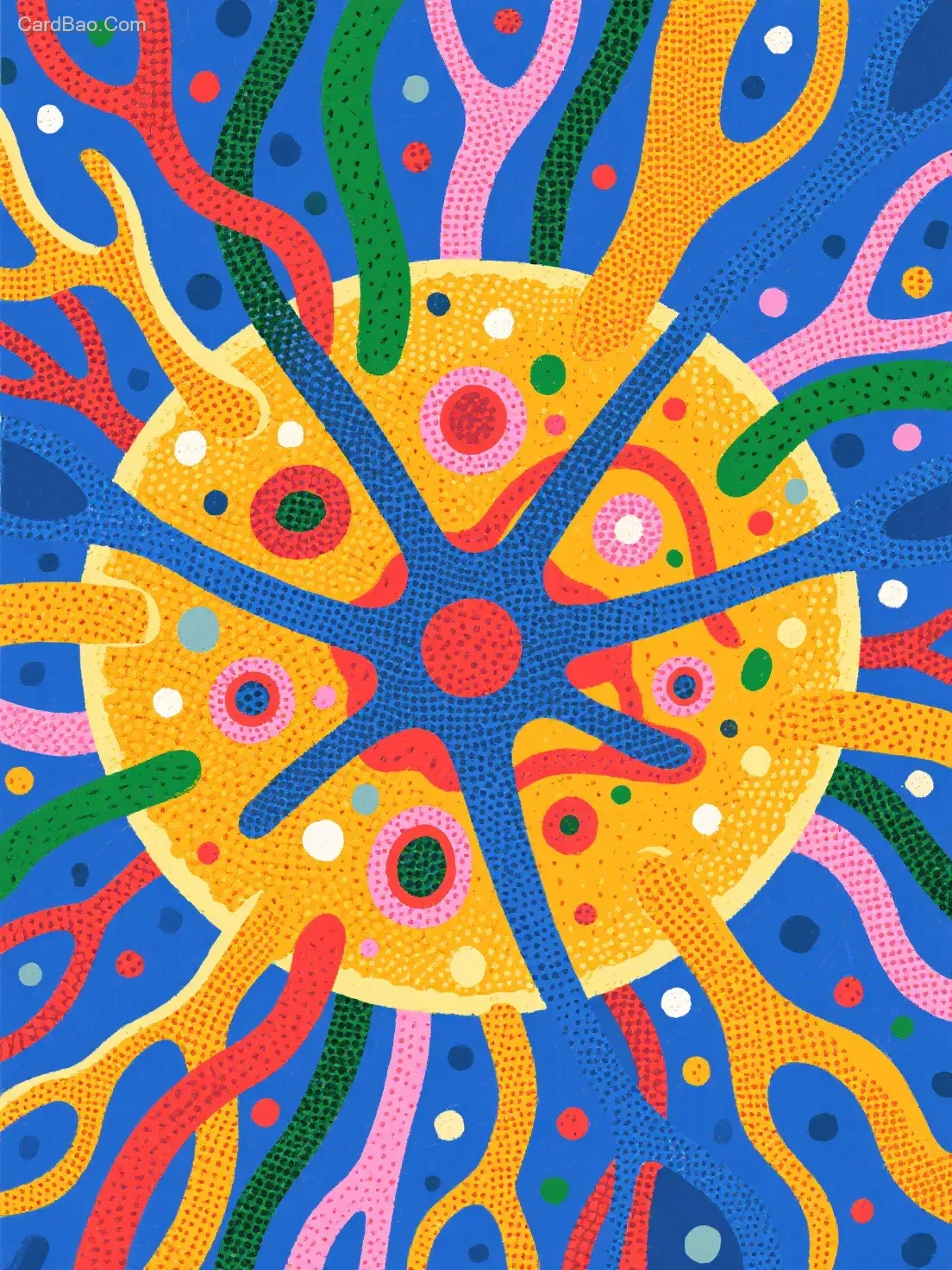 神经元插画,扁平插画,波普艺术,装饰画,马蒂斯配色,神经,细胞,粗糙颗粒质感,超精细,极繁主义