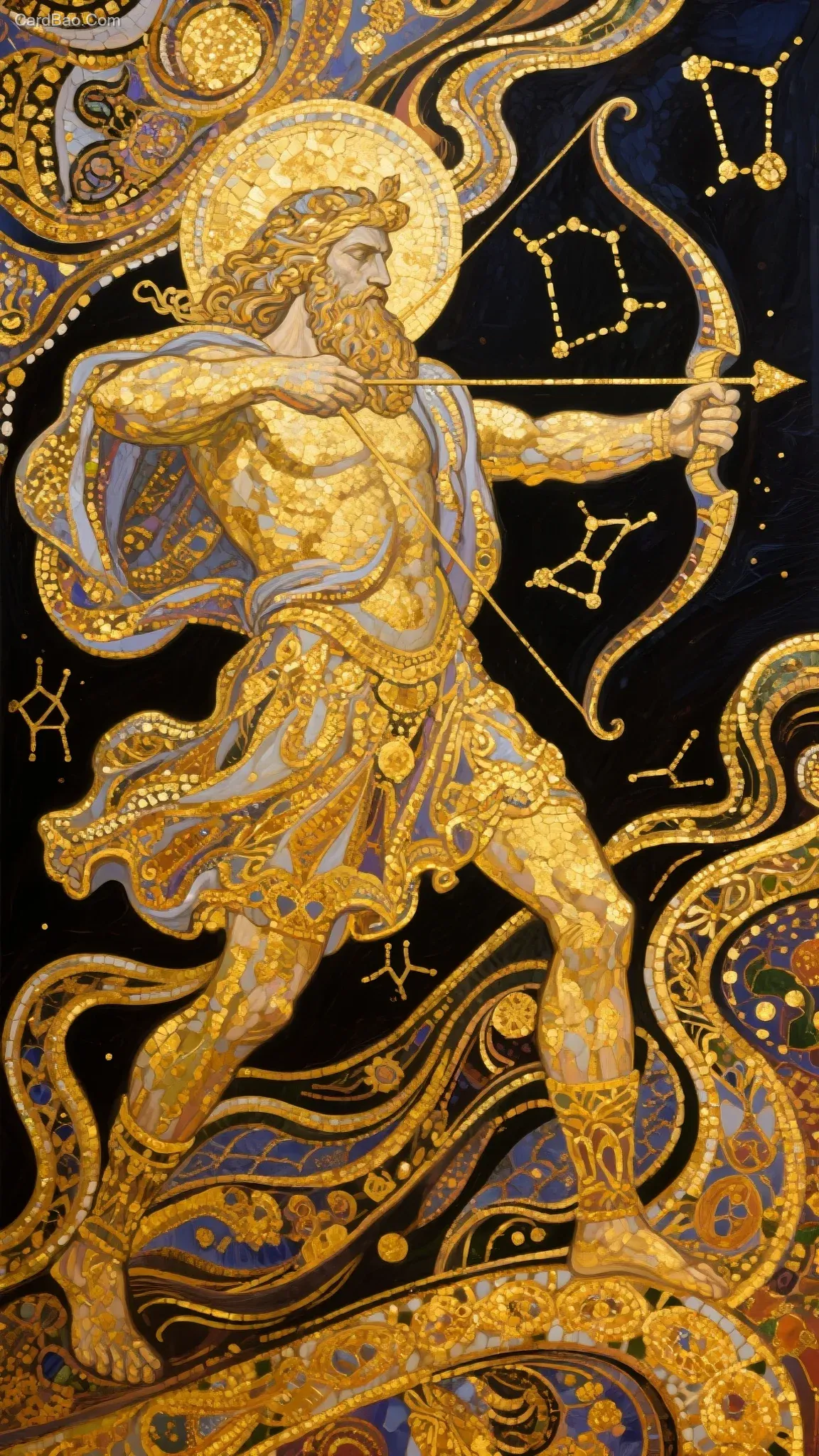 Masterpieces of the Vienna Secession painting masters, expressionism, gold leaf Byzantine mosaic style, in the style of Gustav Klimt, the twelve constellations of Greek mythology: Sagittarius, Zeus the King of the Gods. Stream-of-consciousness background, dark-themed, intricate decorative style, flowing lines, full of opulence and sensuality, gold leaf emitting shimmering light, possessing infinite expressive richness, a mysterious and fervent world, high-quality details, ultra-high-definition resolution, best quality, 8K wallpaper.