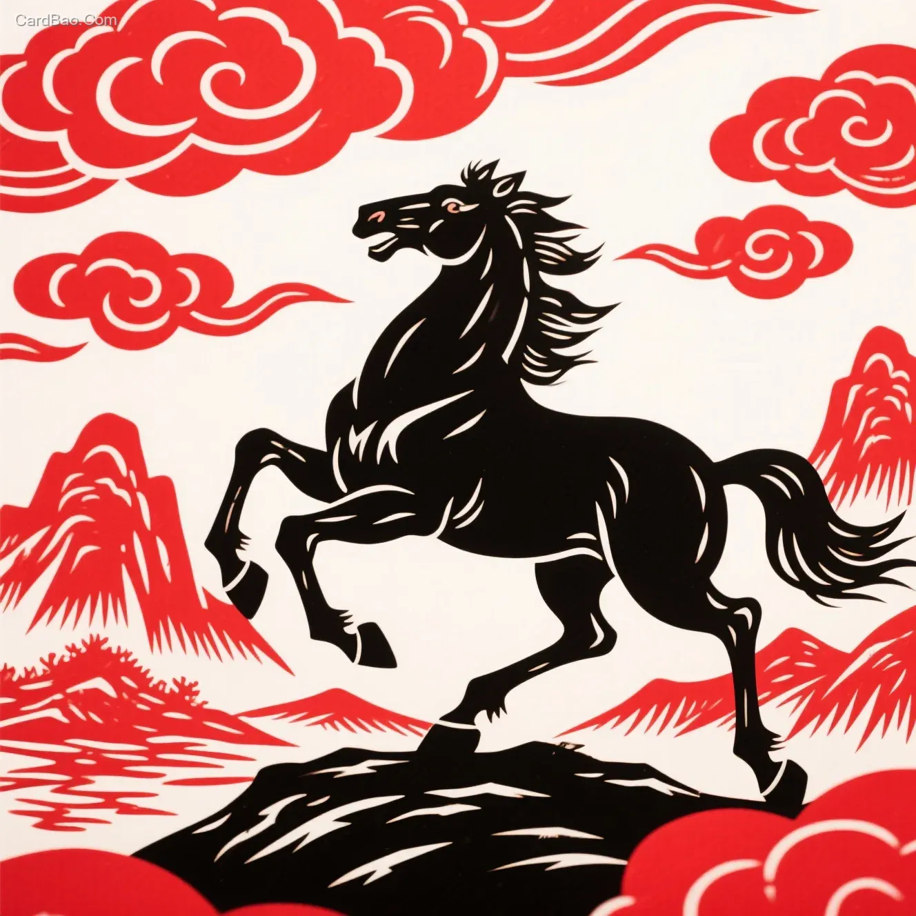 Traditional paper-cutting, immediate good fortune, a black steed galloping, mountains and rivers, red auspicious clouds in the sky, paper-cutting language, symbols, and patterns.