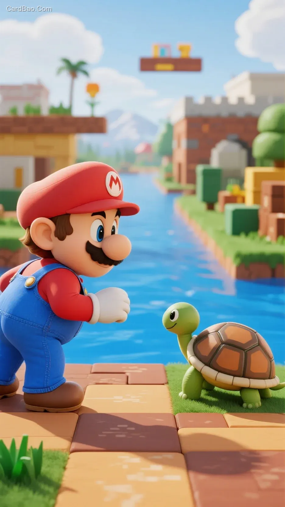 以复古色彩风格呈现任天堂经典游戏《超级玛丽》的游戏画面,3D版且具有电影质感。从左视角展开,展现横版游戏的经典关卡,主人公在游戏中遇见乌龟,画面高清逼真