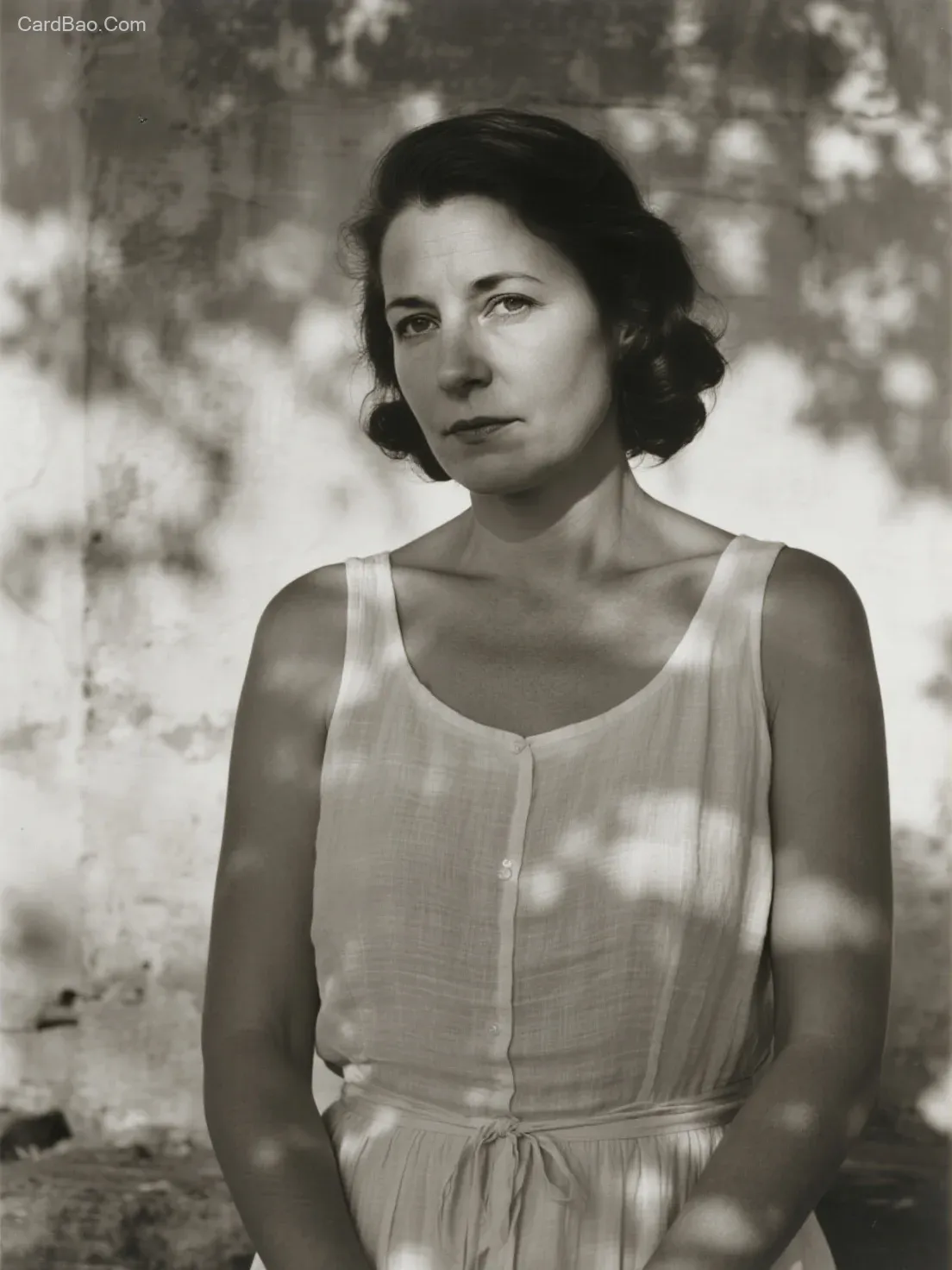 Tarkovsky-style portrait photography, wet plate collodion process, a middle-aged Roman woman, enhanced gaze, skin texture, body dynamics, wearing a white ramie tank dress, mottled wall, light and shadow, dappled tree shadows, black and white portrait photography, grayscale gradient, light mist, award-winning work, high contrast ratio, low contrast and saturation, ultra-clear details, medium format camera, wide aperture, shallow depth of field, extreme light and shadow, delicate bokeh, the art of light and shadow.