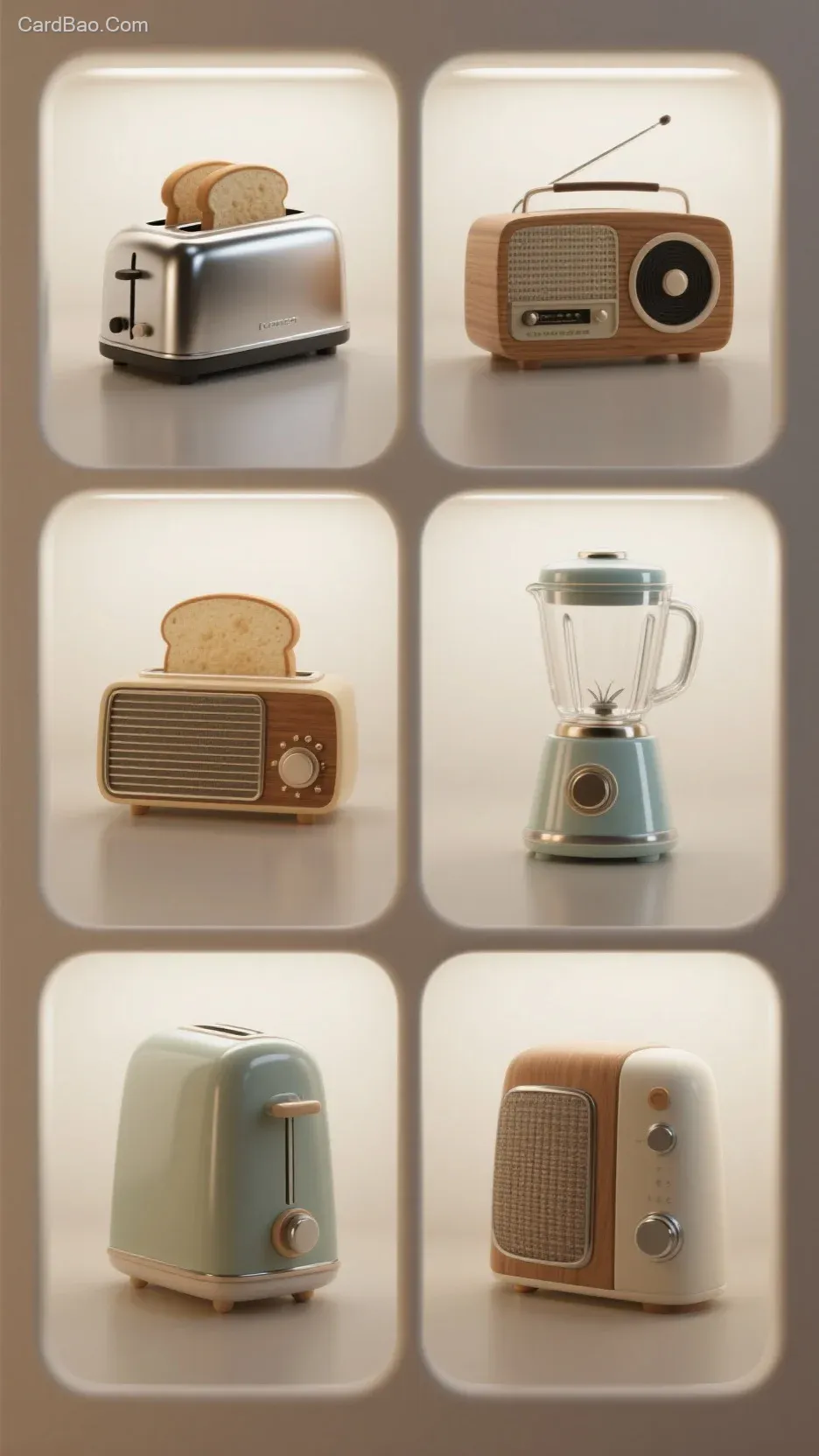 A 3x3 grid layout showcasing nine different types of retro small appliances (e.g., Grid 1 is a toaster, Grid 2 is a radio, Grid 3 is a blender, etc.). All appliances are presented in a lightweight 3D model style with simple, rounded shapes. **The key focus is that each of the nine appliances is assigned a unique representative material, turning the entire grid into a display of material diversity. For example, the toaster could be polished chrome metal, the radio could have a wood grain + fabric texture, and the blender could be glossy plastic—ensuring that the grid presents nine distinctly different materials (covering metal, plastic, wood, ceramic, glass, fabric, etc.). The lighting is soft and even, with a simple background. The goal is to present an engaging composition while highlighting the diversity of retro appliances and the variation in materials. High resolution, 3D rendered.
