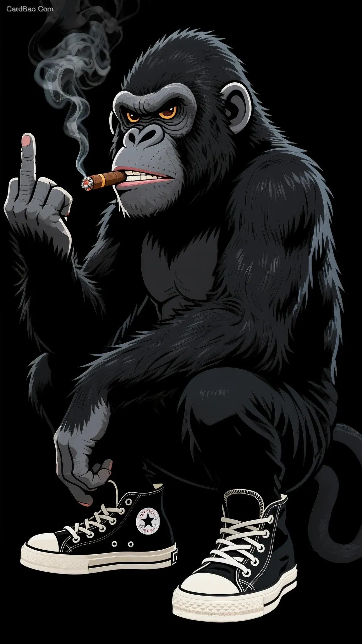 一只拟人化的黑猩猩,表情凶狠,嘴里叼着冒烟的雪茄,一只手竖起中指,蹲在地上,穿着黑色帆布鞋 。“一只拟人化的黑猩猩,黑色毛发,表情凶狠,嘴里叼着冒烟的雪茄,一只手竖起中指,穿着黑色带白色鞋带和标志的帆布鞋,背景为黑色,卡通整体风格街头潮流、叛逆”。