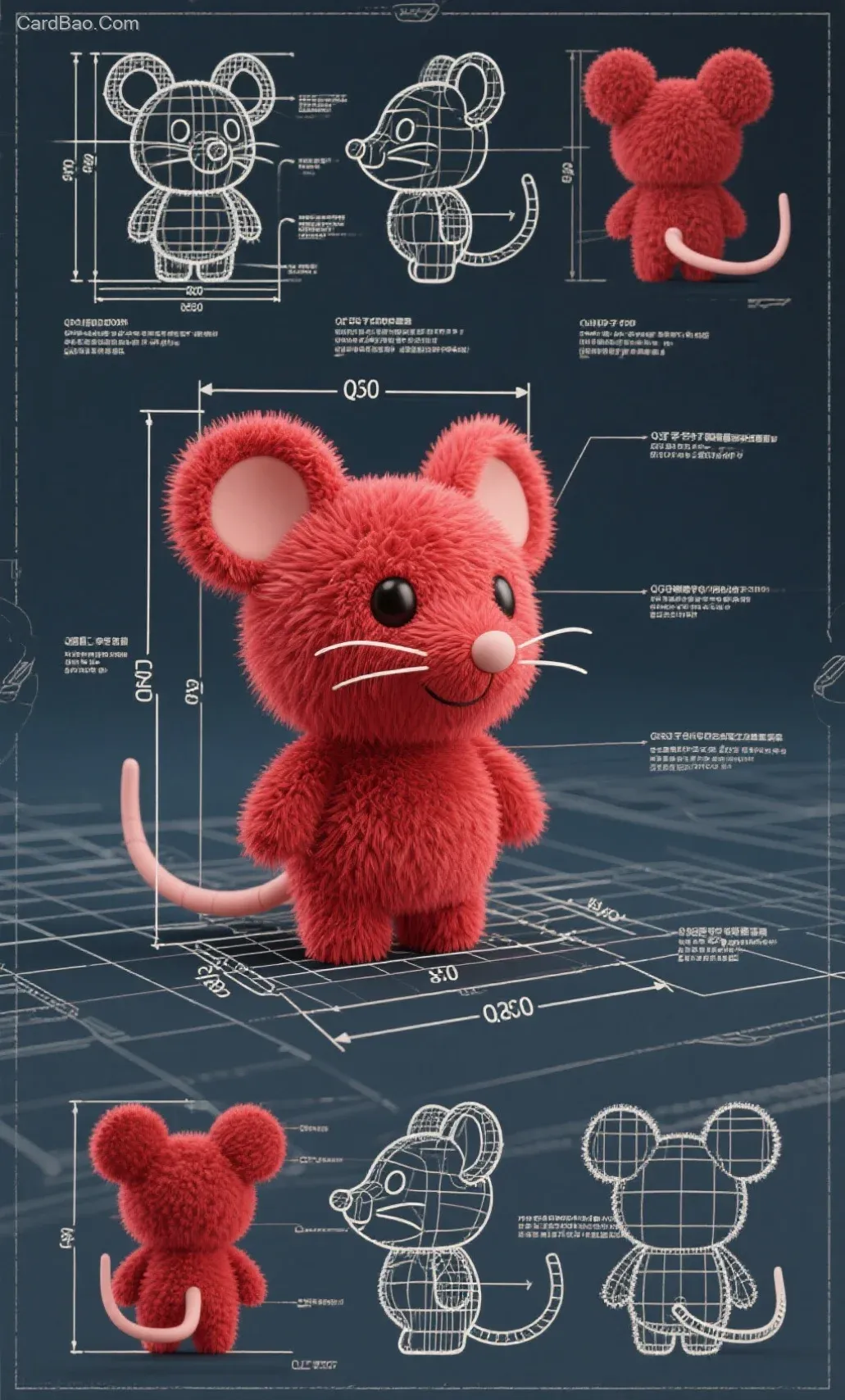 以蓝图的风格制作Q版的子鼠吉祥物玩偶,红色毛茸茸,设计草图。并包括尺寸和解释性文本注释。应使用线条和测量值来指示各个部位的尺寸,给草图以技术和详细的感觉。除了主要设计外,还包括显示不同角度的零散缩略图,立体景深