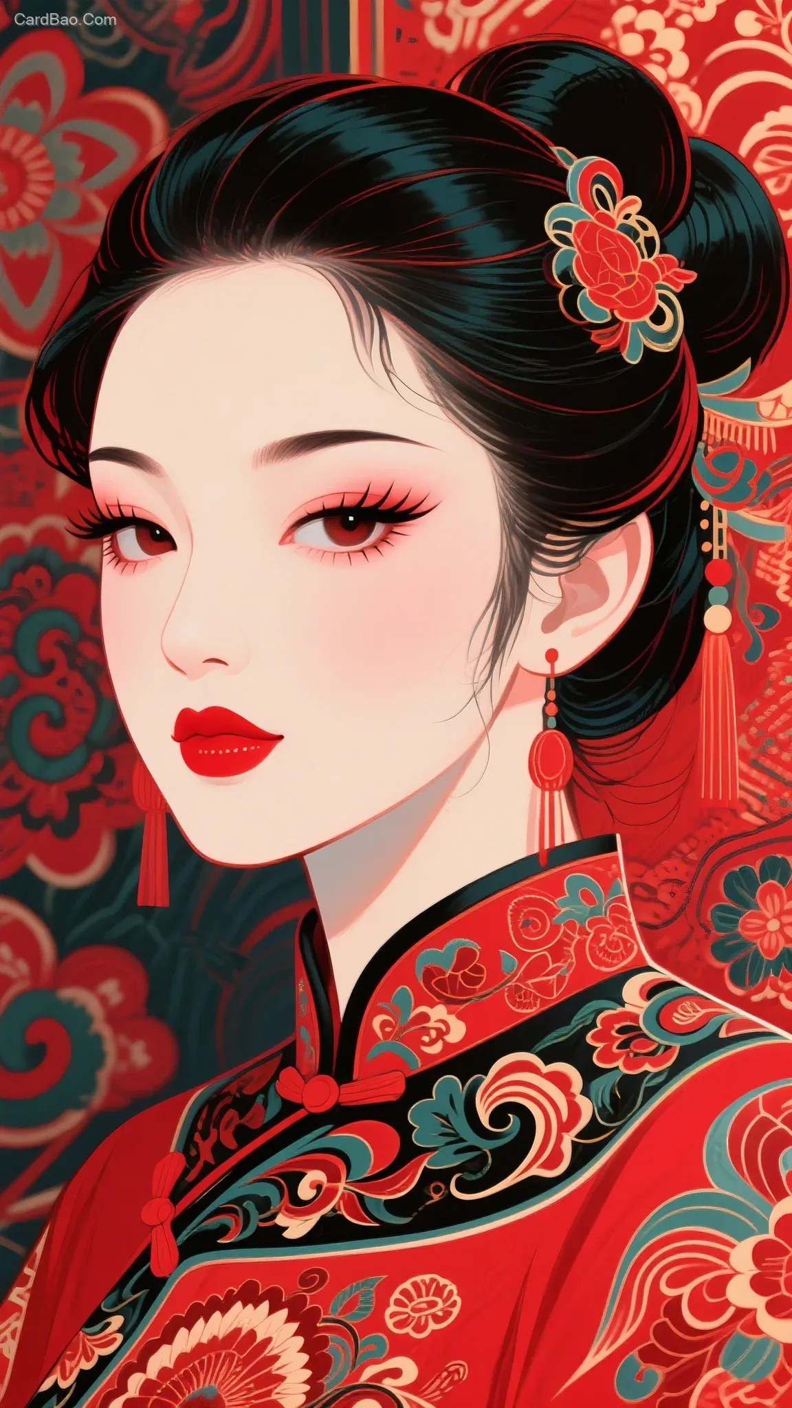 Stunning beauty, thick eyebrows and big eyes, long eyelashes, red lips, various hairstyles, fashionable and modern, traditional batik, Chinese trendy illustration, fluorescent texture, red color scheme, ultra-detailed, traditional patterns, highest quality, illustration style.