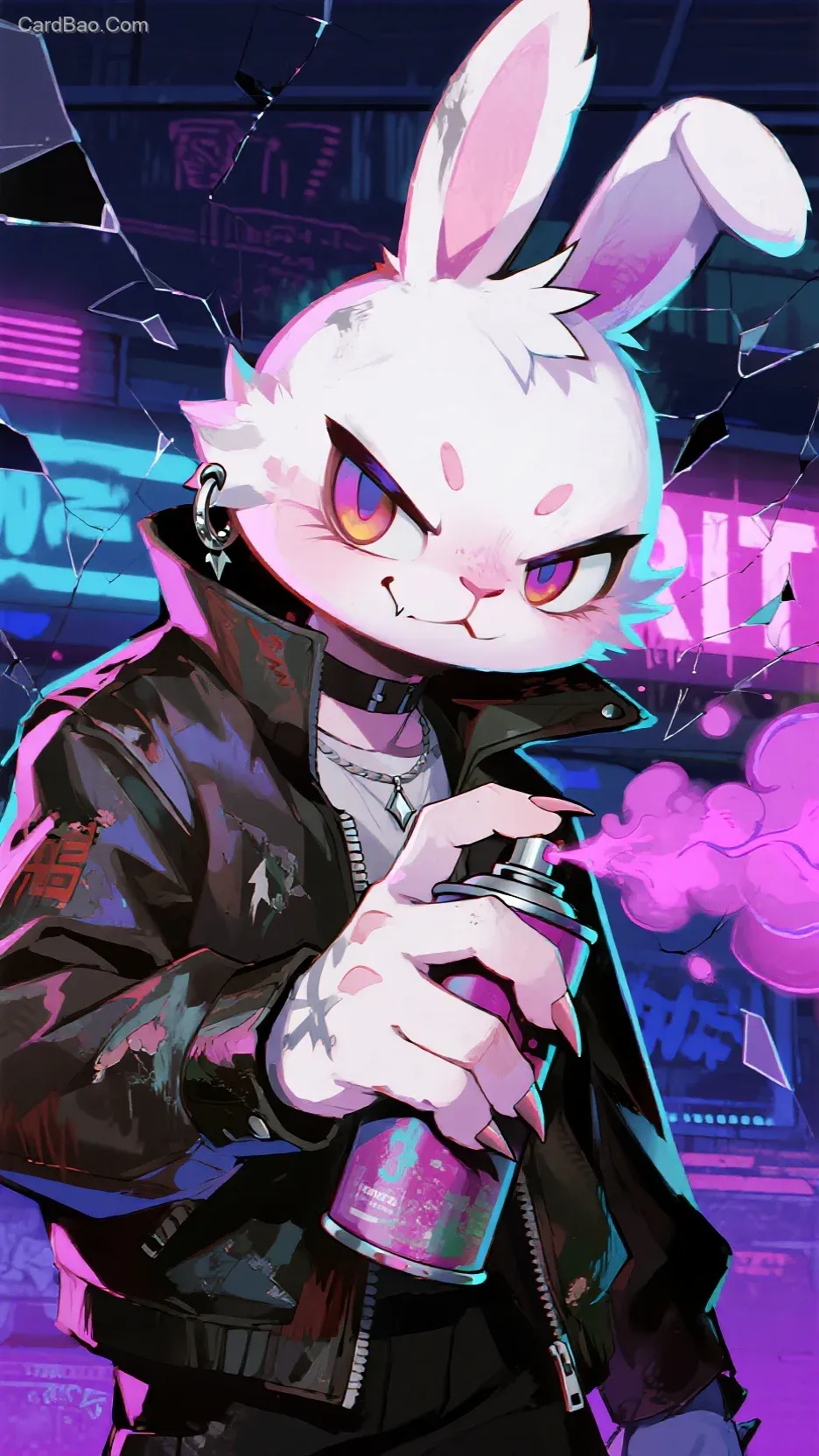 流氓兔半身特写,街头涂鸦与数字插画结合风格,采用霓虹色系与粗线条轮廓,角色保持单眼微眯的狡黠表情,破旧皮夹克表面叠加半透明喷漆效果,左耳佩戴锯齿状金属耳环,手持涂鸦喷罐喷出粉紫色光雾,背景融入破碎的霓虹灯牌与蒸汽波纹理,兔爪尖锐处添加金属