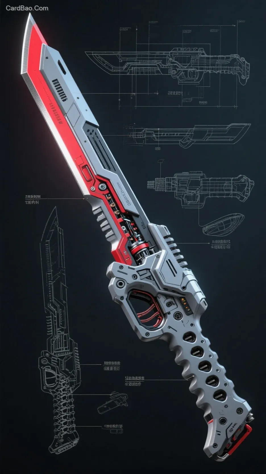 一把赛博风格的横刀,虚拟蓝色小子介绍横刀的各个部位(刀尖,刀刃,刀身,护手,刀柄,握把,尾骨),整体灰色金属色,亮红色刀刃,机械设计图,制作草图,CAD设计图,分解图与内部零部件一致。超清摄像,3D效果,OC渲染。细节丰富,精细画质,32K。
