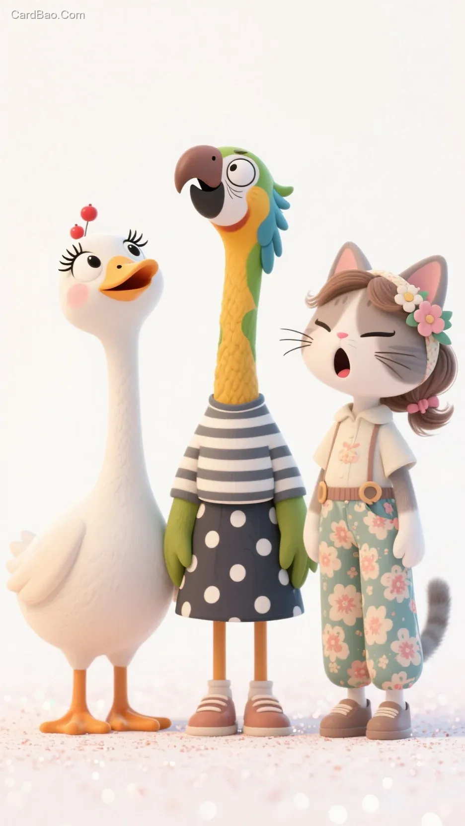 三个身高各异的丑萌漫画鸭子鹦鹉小猫并排站立,细长脖颈仰望着上方,水润长睫毛下镶嵌着樱桃小嘴与翘鼻头,条纹衫、波点裙与碎花裤呈现各异服饰,松散盘发点缀着蝴蝶结、发带与花朵发饰,3D渲染的磨砂白背景中浮现金粉颗粒,夸张的眯眼笑、惊讶张嘴与皱眉表情碰撞出卡通萌趣感,厚涂笔触融合小清新色块。
