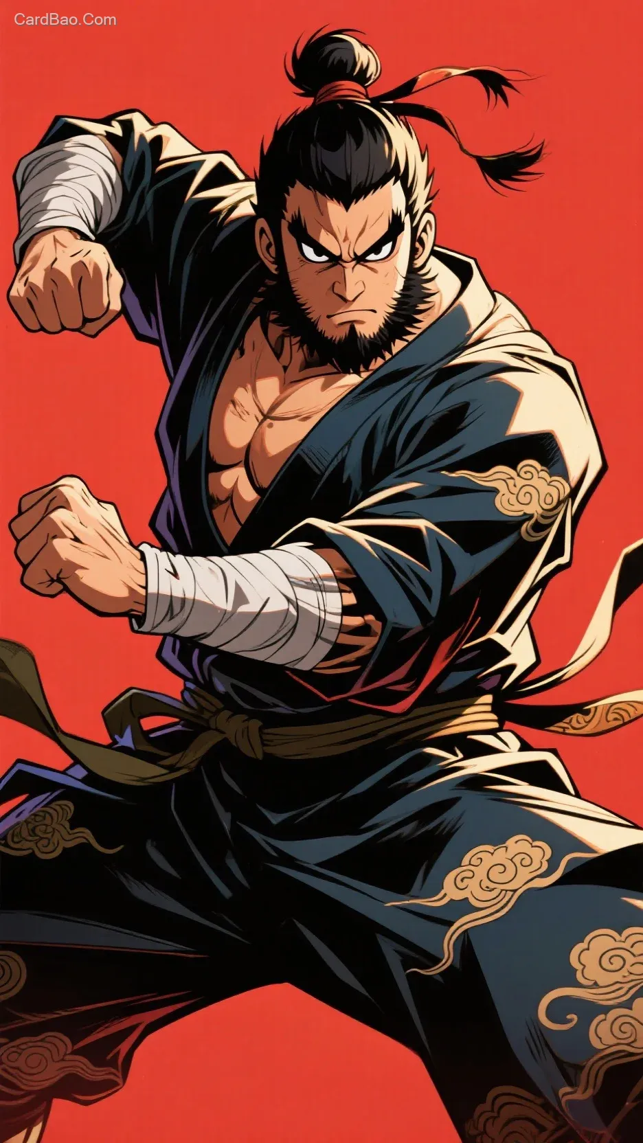 用JOJO风格生成忠义之士李逵的图片。人物呈极具张力的武术动态姿势,面部线条硬朗,眼神锐利,整体色彩浓烈,人物与背景色对比强烈,光影效果突出,亮部与暗部界限分明。线条粗重清晰,服饰褶皱处有粗细变化,点缀中国传统云纹