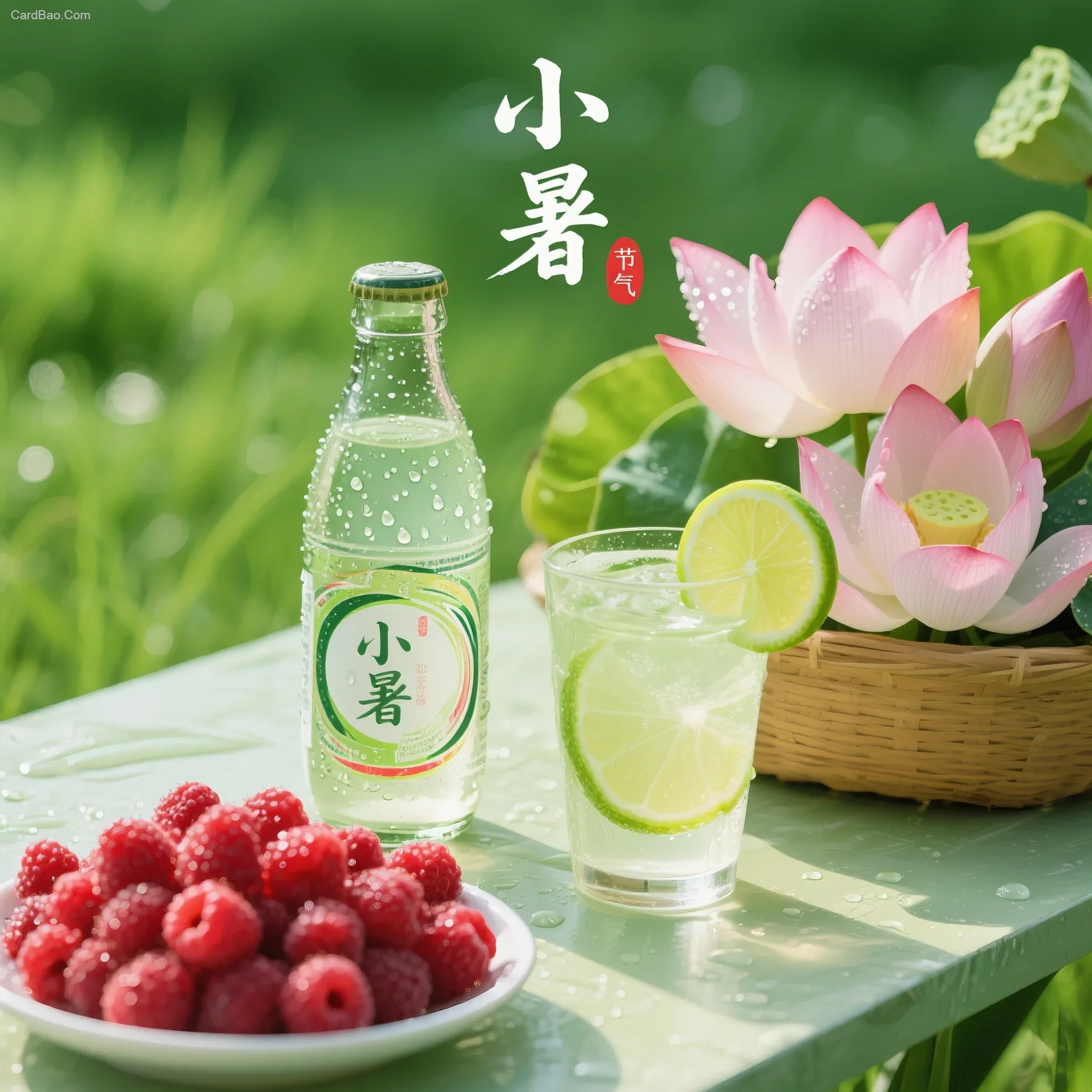 背景绿的发亮的草地,一张桌子,一瓶冰镇的汽水,瓶身上有水珠,瓶口有盖子,瓶身标签写:小暑,满满一篮子荷花,荷花上有水珠,上方居中手写:小暑 小红印章写:节气 一杯冰镇青柠檬水,一片青柠插在杯沿,杯身上有水珠,高清,一个青柠,一盘杨莓上有水珠,杨莓又红又大,色泽鲜亮