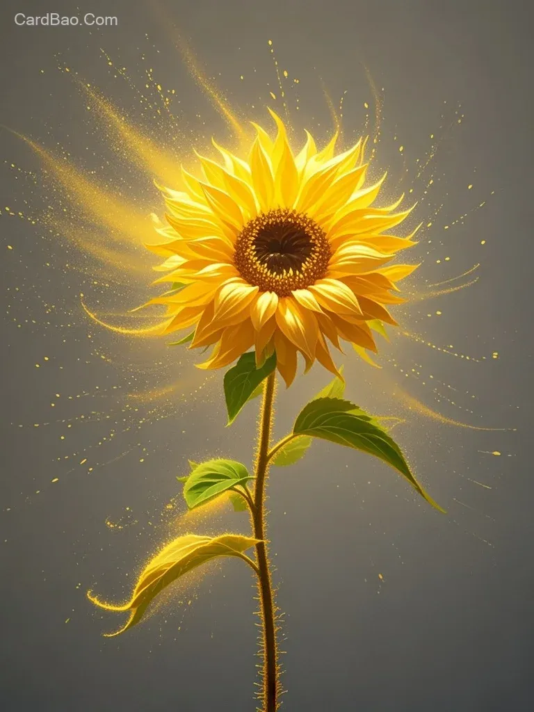 用极细梦幻粒子绘制,艺术粒子,审美粒子,魔幻粒子,一枝黄色向日葵轮廓,意境构图,极简风格,杰作,丁达尔光,中心发光,粒子特效,粒子飘逸,大面积留白,,渲染出神话般的辛烷值,高清,32K,赛博粒子,魔法粒子,水墨画。超高清晰,大师级手笔。