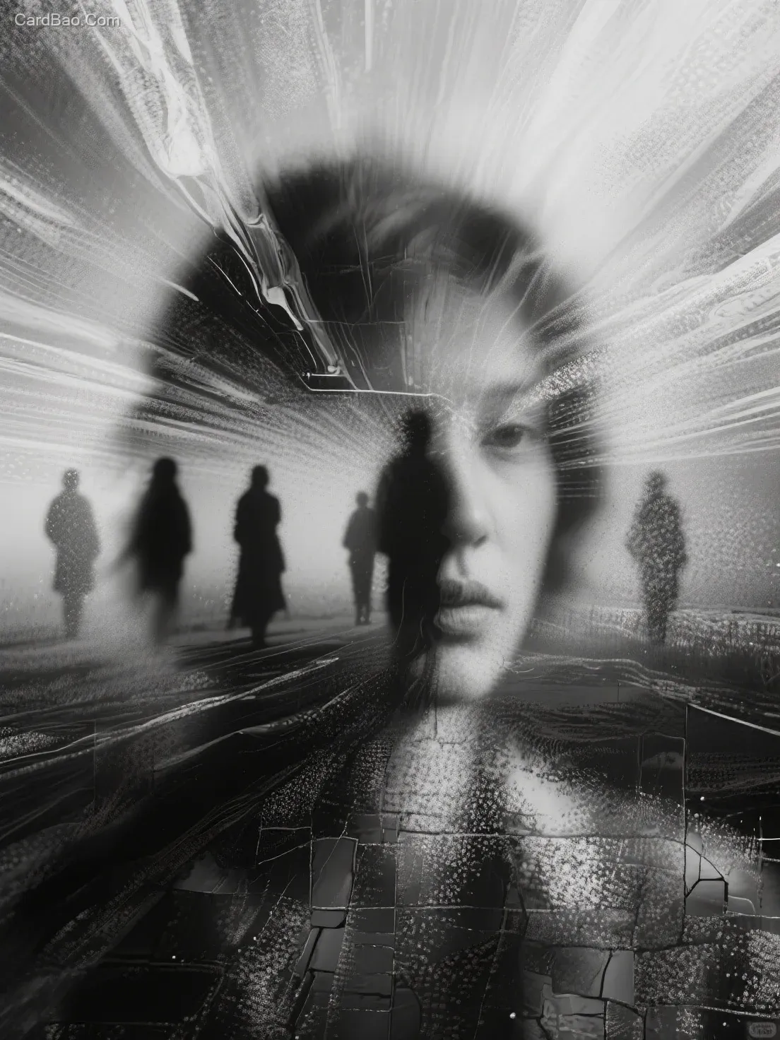 视觉艺术,强烈夸张的构图,夸张的透视,拼贴艺术,黑白,模糊的灰度,暗色调,超近景人像,远景与场景,双重曝光,变形,模糊而隐约的人影,忽略并模糊细节,超梦幻的视觉效果,光影效果,光影美学,弥散式模糊,模糊光晕,模糊美学,多重曝光,多个影子,强烈的透视感,超广角,失焦,特写失焦,颗粒质感,强烈的胶片颗粒感,奇幻,完全失控。蔓延,梦核风格,留白,强烈的胶片颗粒感,暗灰色调风格,获奖摄影作品,印象派,超现实主义,完美的画面呈现,高端质感。