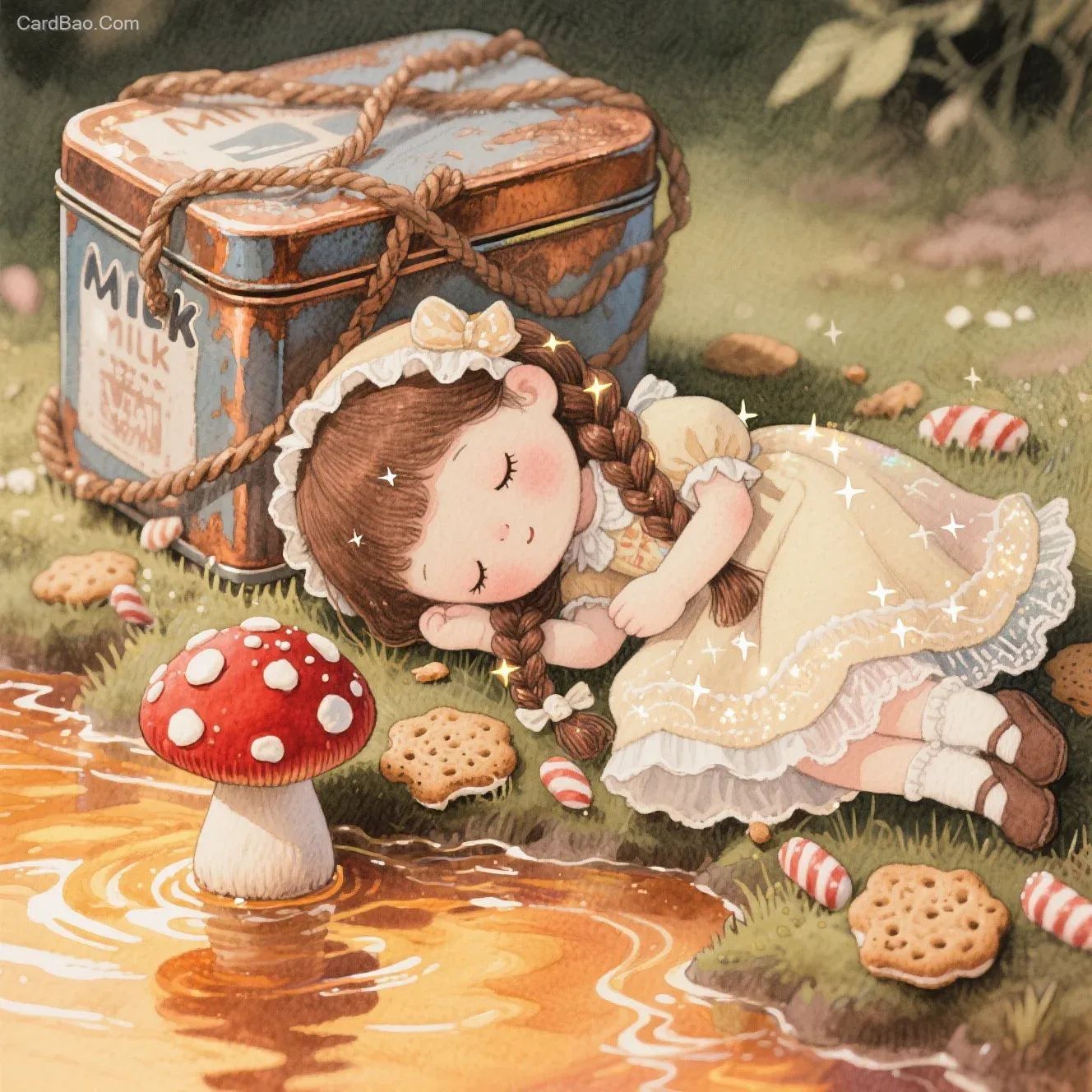 Close-up of a ragdoll girl sleeping, her braids twinkling with starlight. Where her skirt brushes past, cookie crumbs transform into nodding little mushrooms, their caps dusted with clear red sugar frosting. The background features a tin box with copper vines entwined, milk candies melting into an amber-hued river, its surface reflecting light, all rendered with a vintage watercolor texture.