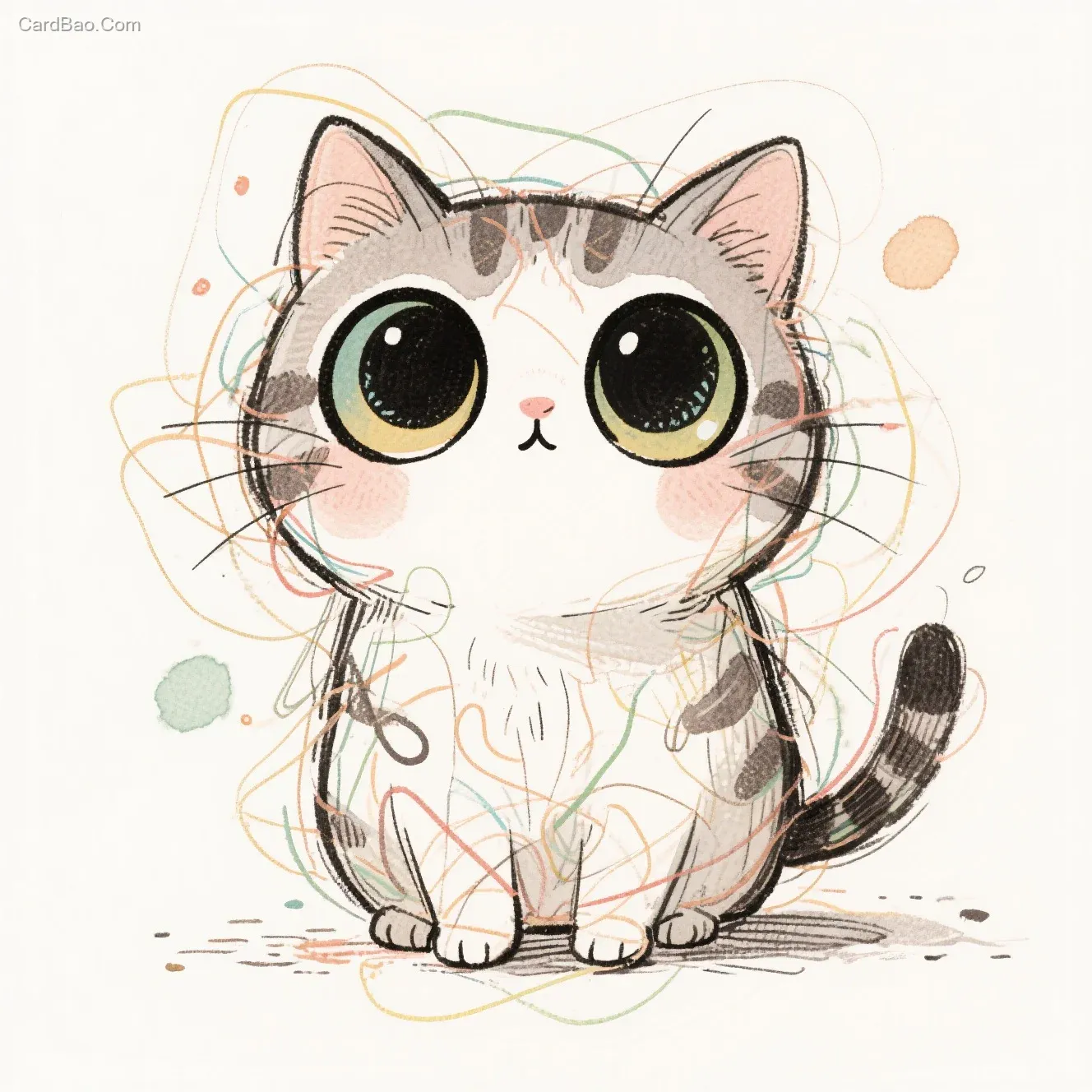 画的是一只呆头猫。大眼睛,鱼眼镜头,插图是手绘的,杂乱的艺术线条。Q版,诙谐,插画,水彩平铺