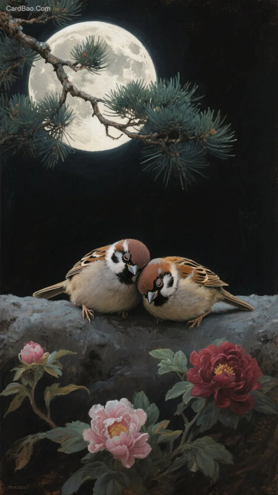 花好月圆,画面左上侧伸出一枝松枝,枝叶繁茂,两只色的小鸟紧紧依偎在一起,闭目睡觉,油画写实风格暗黑