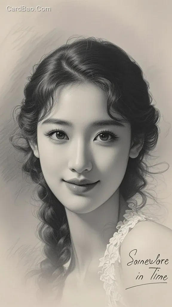 眼眸明亮,熠熠生辉;唇角轻扬,微微上翘。神韵尽藏于纸间,令人心醉于这幅芳华之景。右下方古典花式手写体[SOMEWHERE IN TIME]